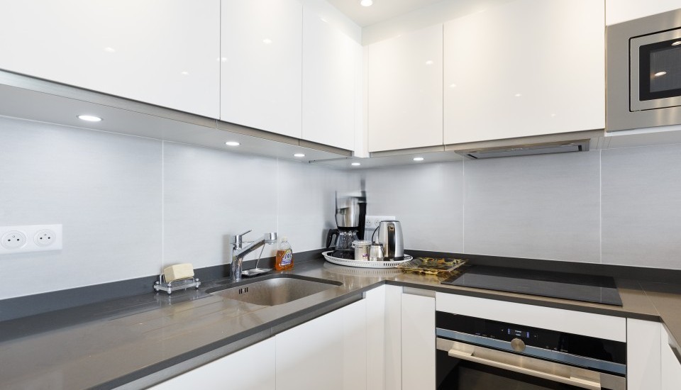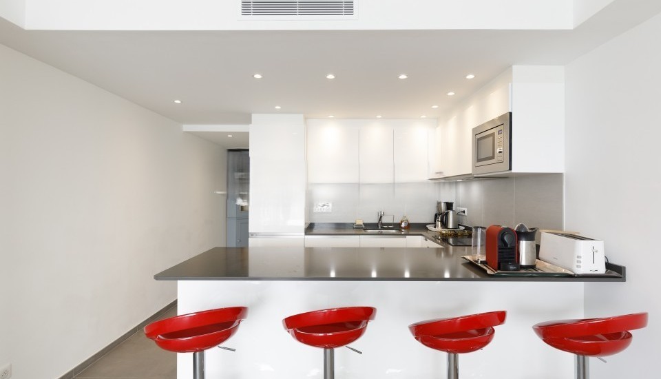 Modern and fully equipped, featuring a bar counter with high stools. Amenities include a Nespresso machine, kettle, toaster, electric glass cooktop, oven, and more.