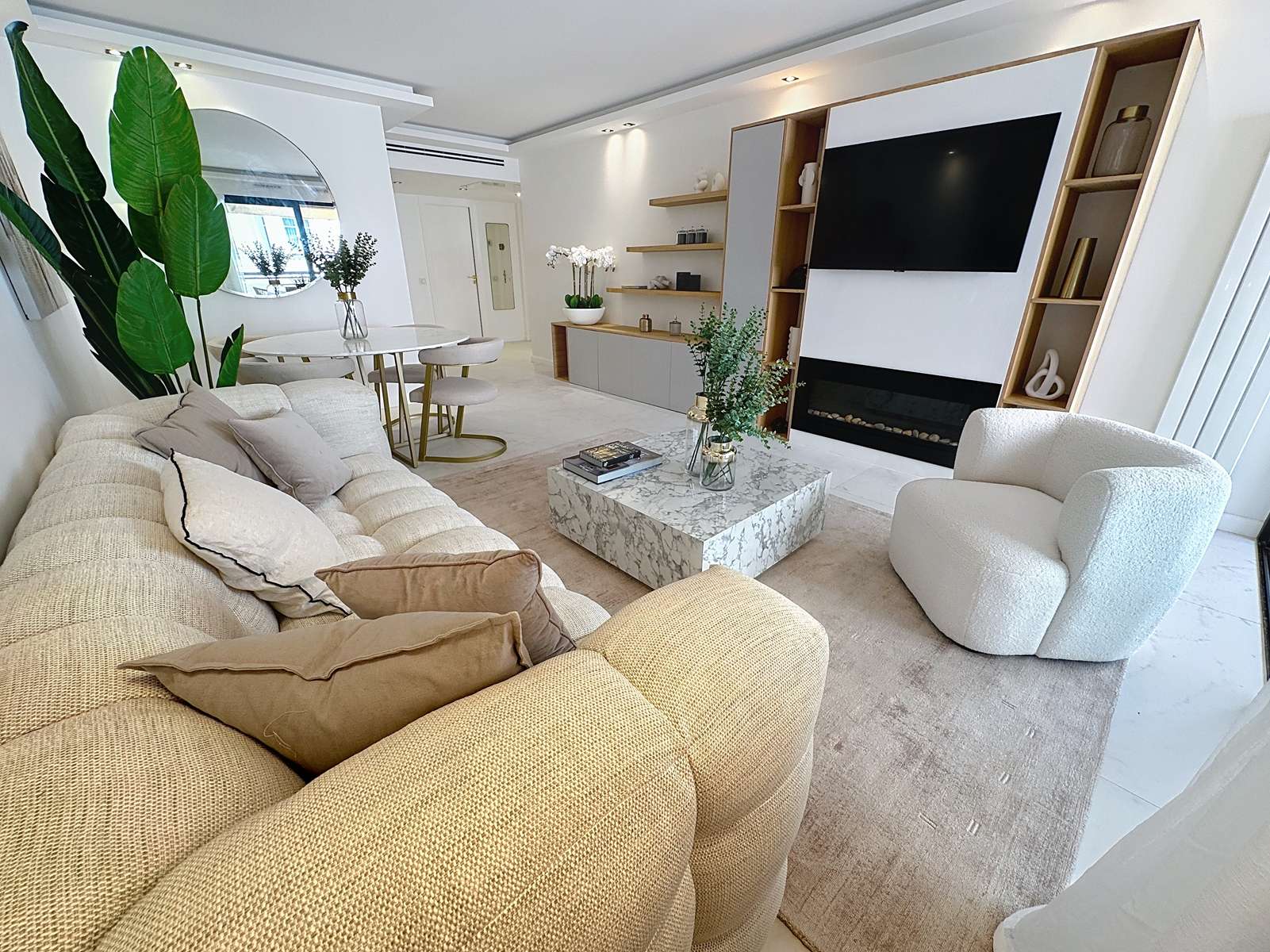 Large living room with modern and quality furniture. Couch, flat screen tv, dining table for 4.