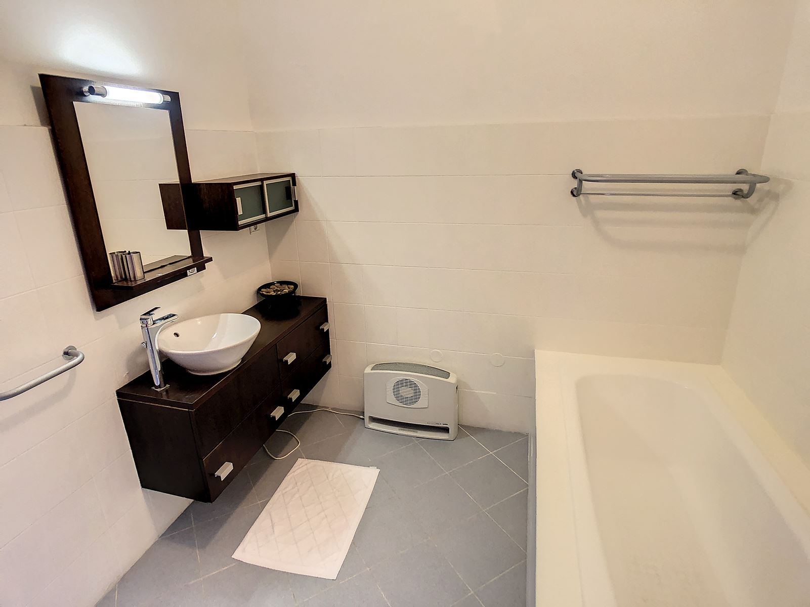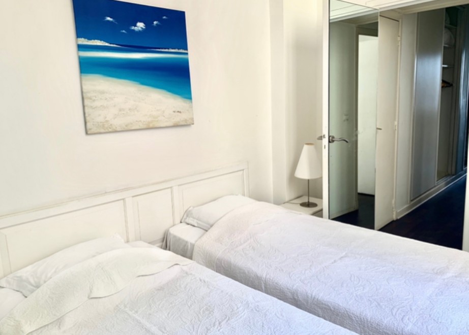 The apartment offers two bedrooms. The first bedroom includes twin beds and an en-suite bathroom with a bathtub and toilet. The second bedroom also has twin beds and a private shower. An additional guest toilet is available.