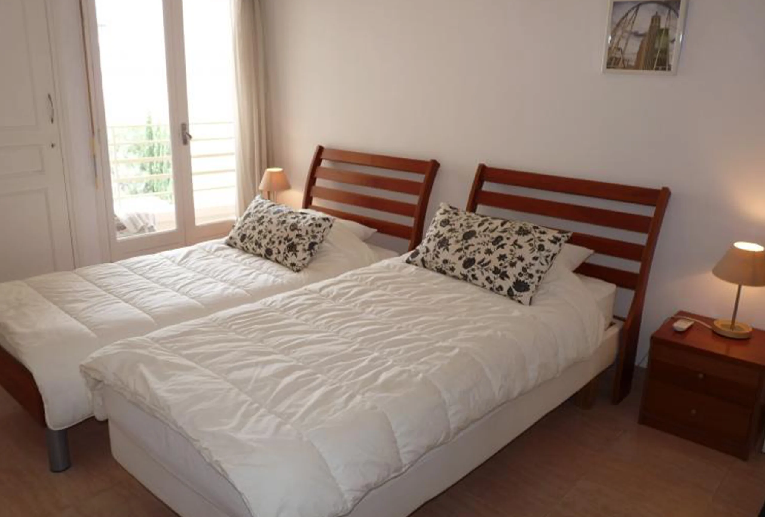A bright and spacious two bedroom, one bathroom apartment in the heart of Cannes. Right by the Martinez Hotel and a few meters only from the Croisette and its sandy beaches. The apartment is ideal for congresses and holidays as it is so close to the Croisette, the Palais des Festivals and the Hotels on the Croisette. In a well kept secure building, this two bedroom apartment boasts very spacious rooms. The living room is very bright and comfortable. It is equipped with broad band, wifi, internet connection, and a TV and DVD player. One of the bedrooms has two single beds, and the other one has a double bed. There is also a sofa bed in the lounge for unexpected guests.