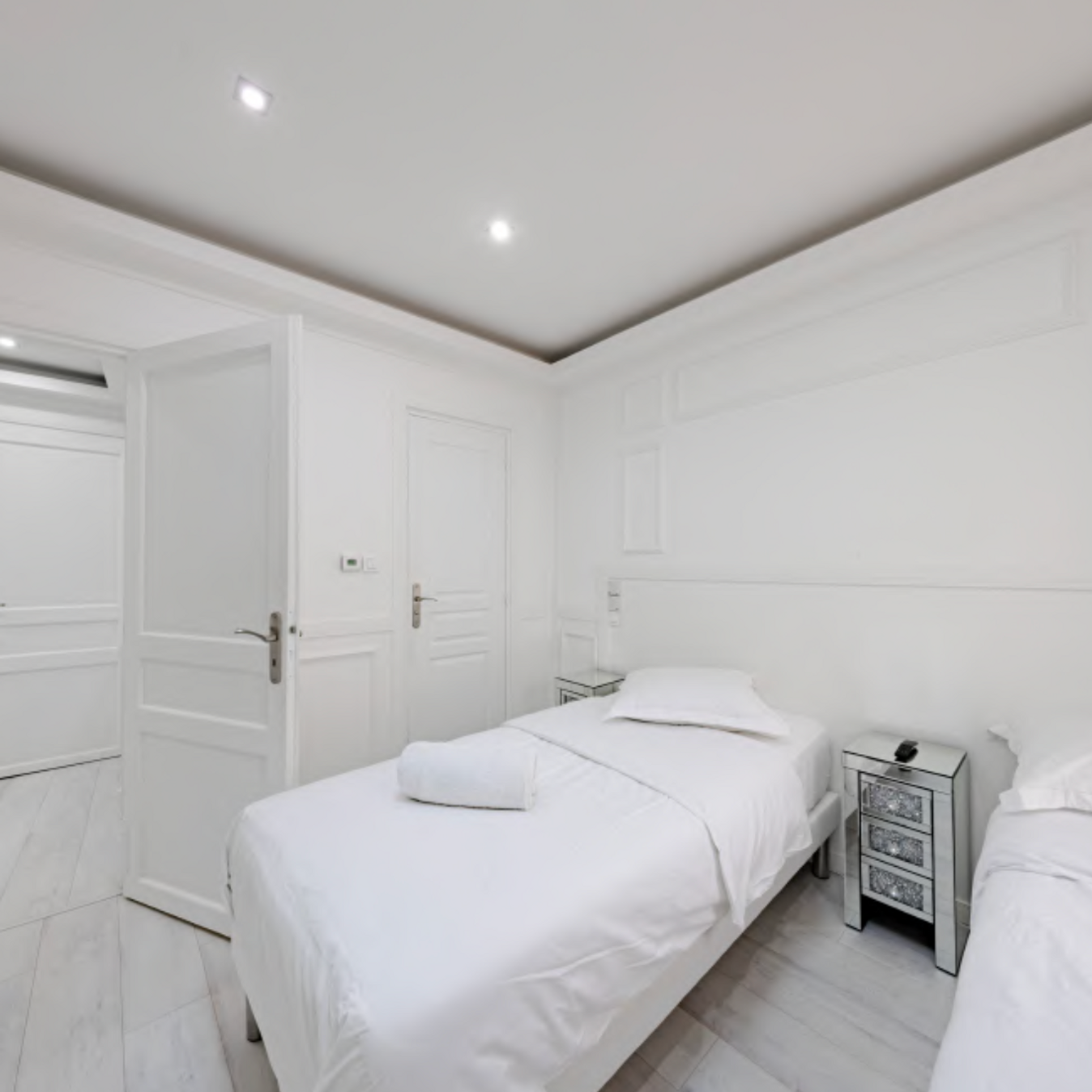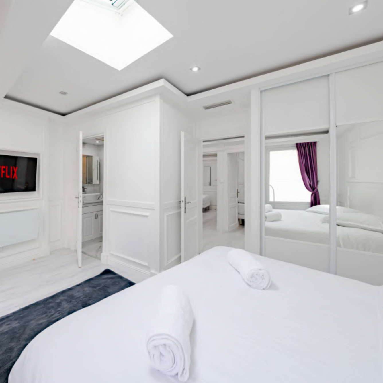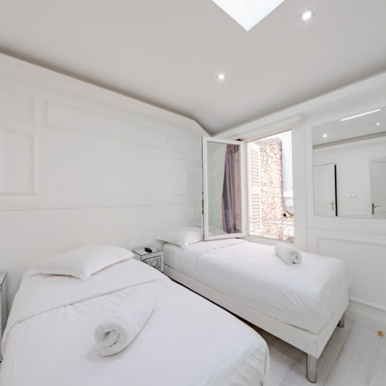 Beautiful 101 sqm duplex apartment (villa) ideally located, fully equipped and air- conditioned, it consists of three bedrooms and three bathrooms (en-suite), one living room with a kitchen, and a terrace of 7 sqm. On the ground floor. Wifi and air conditioning. 7 min from the Palais des Festivals and the beaches of Cannes.