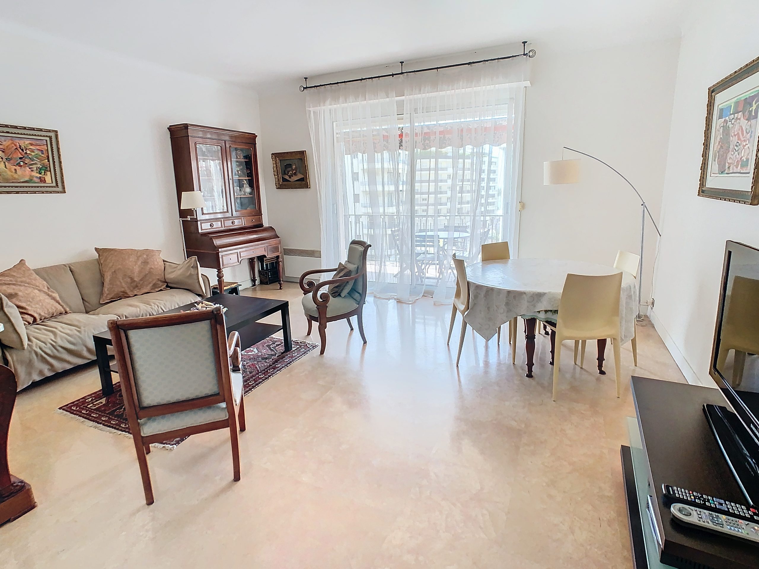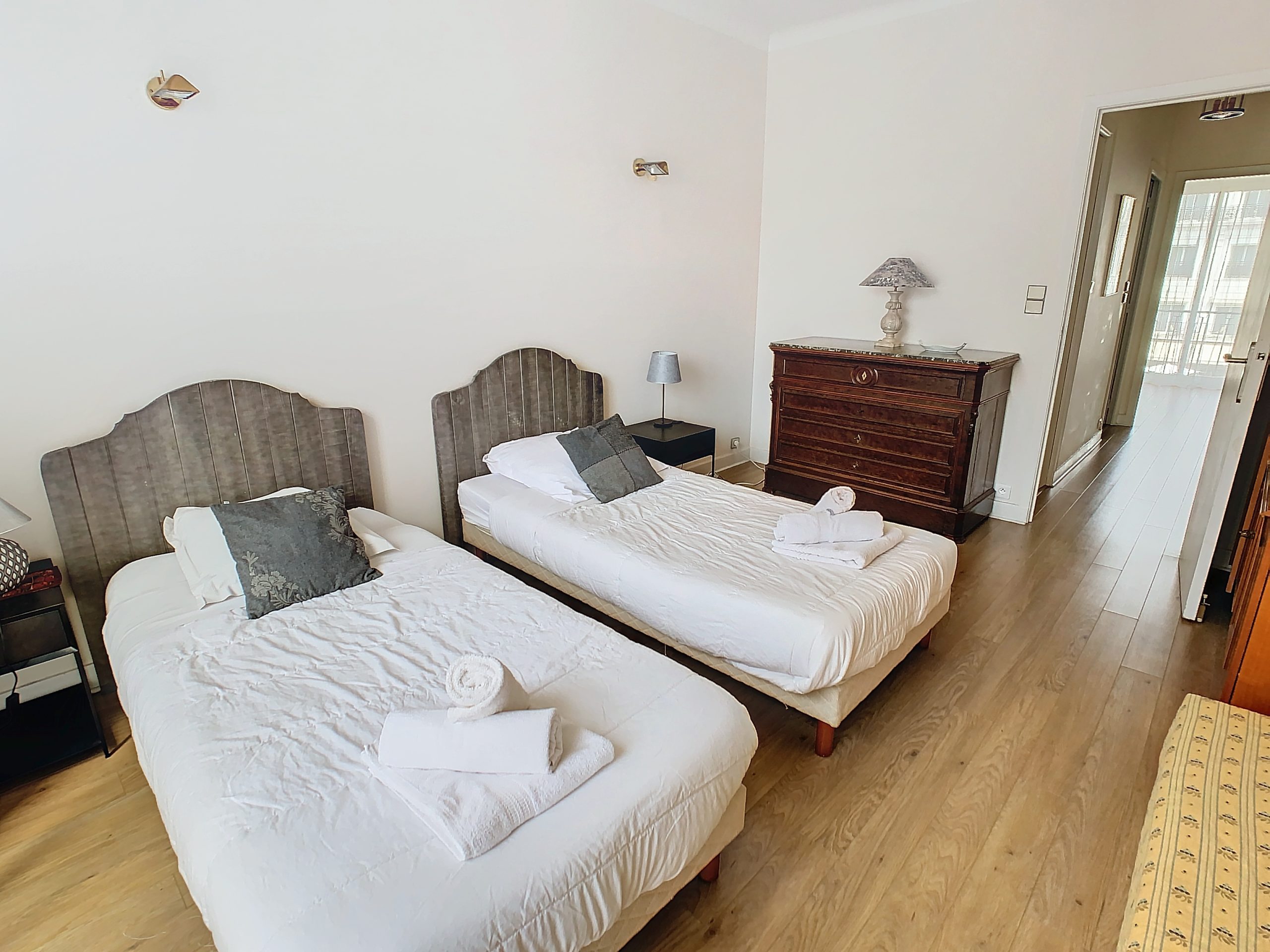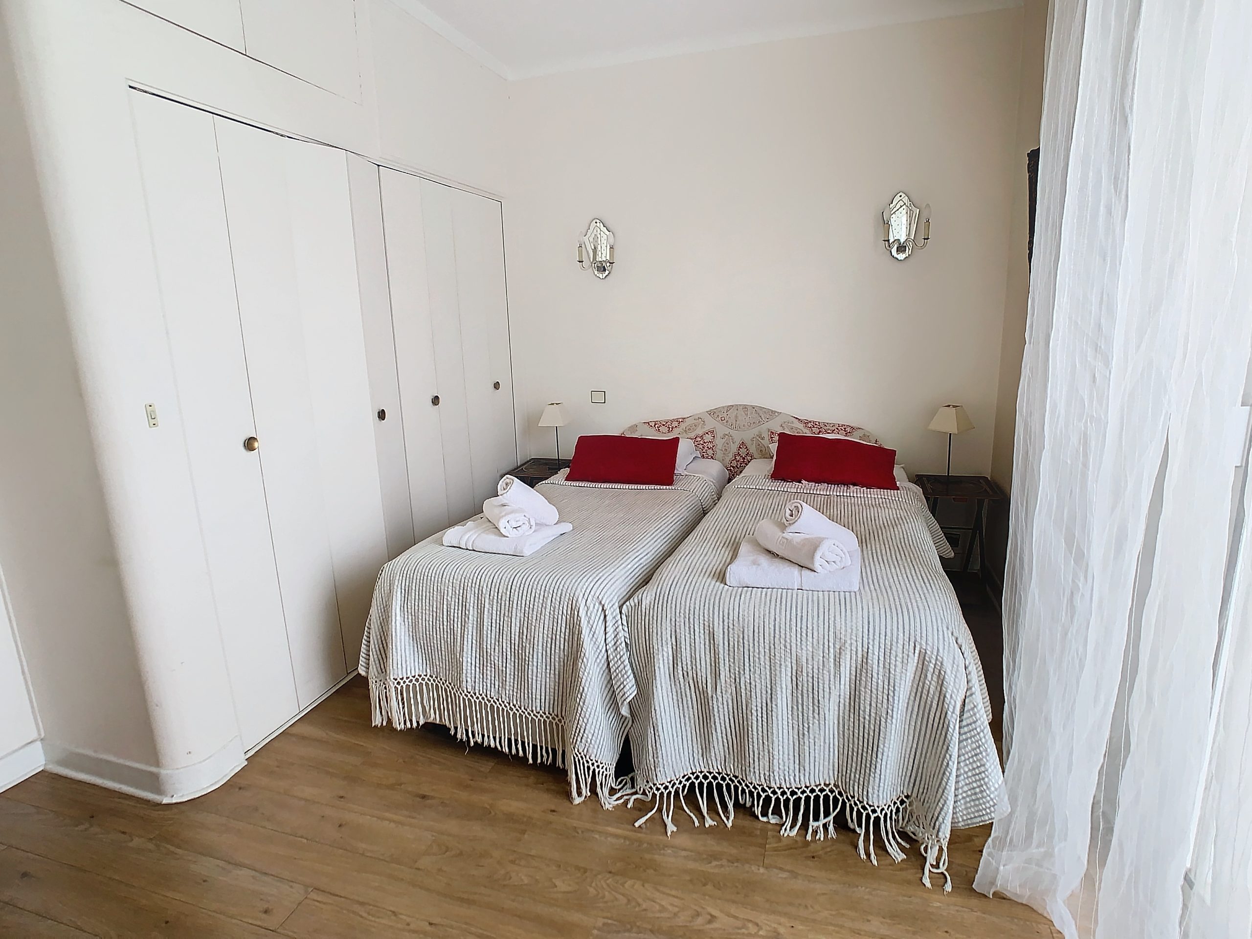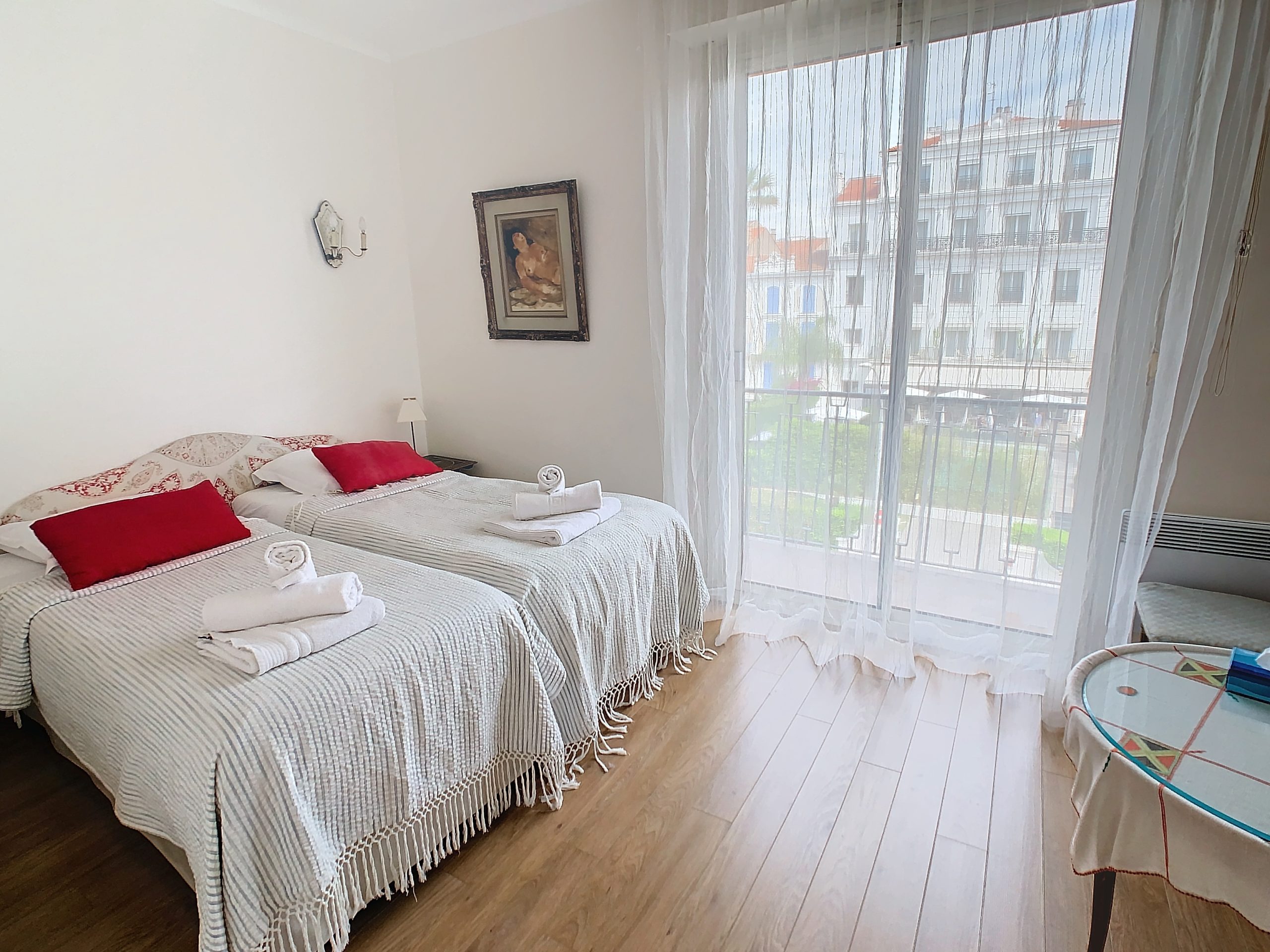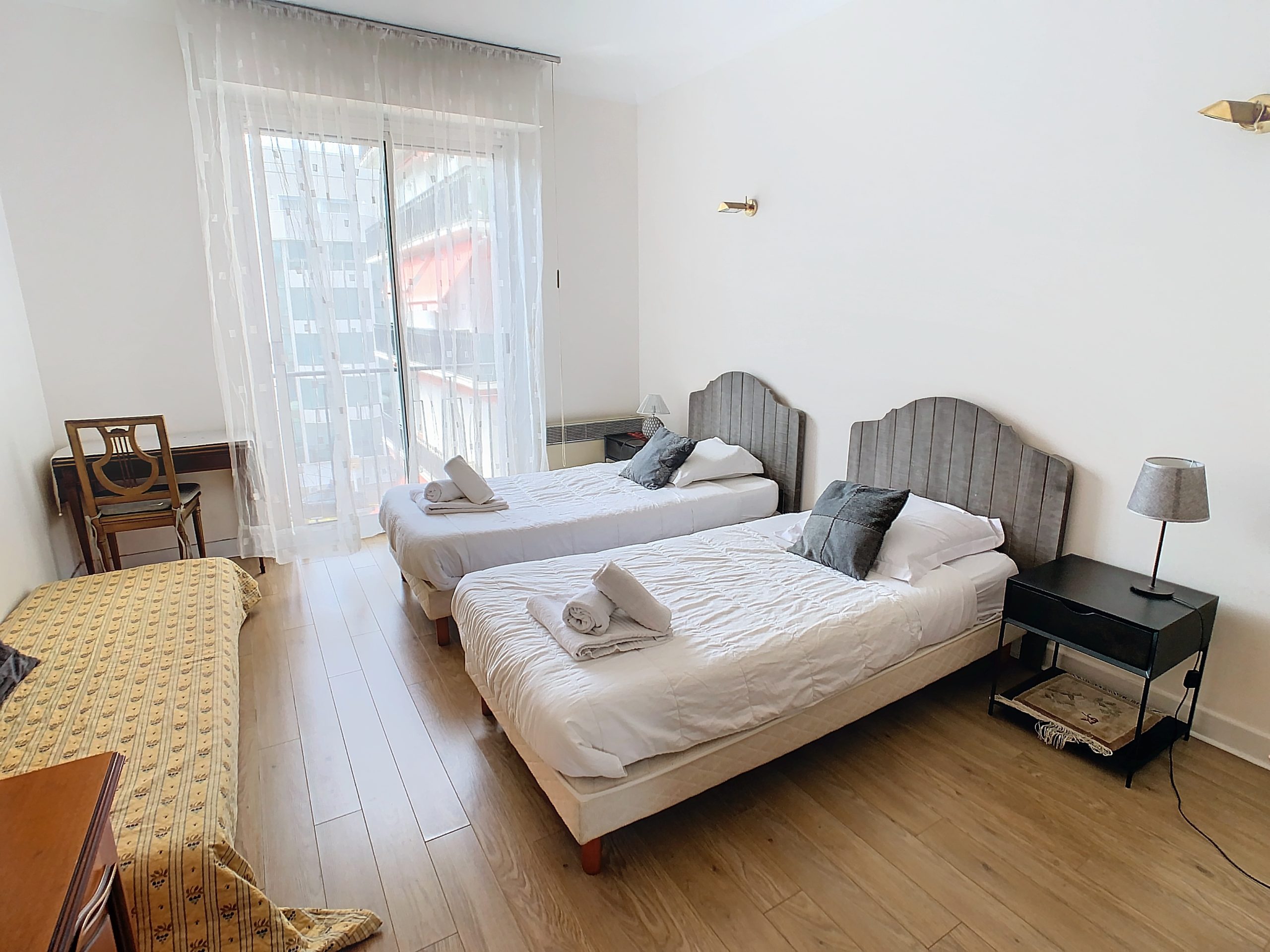 Two bedroom apartment of 70 m2 on 3rd floor front crossing south – north with sea view, comprising an entrance hall, living room with sofa, two bedrooms with two single beds (4 x 90 cm), and possibility of double beds, a bathroom bathroom, a separate toilet, a fully equipped kitchen (oven, microwave, dishwasher, washing machine, stove, fridge …), a south facing terrace and internet.