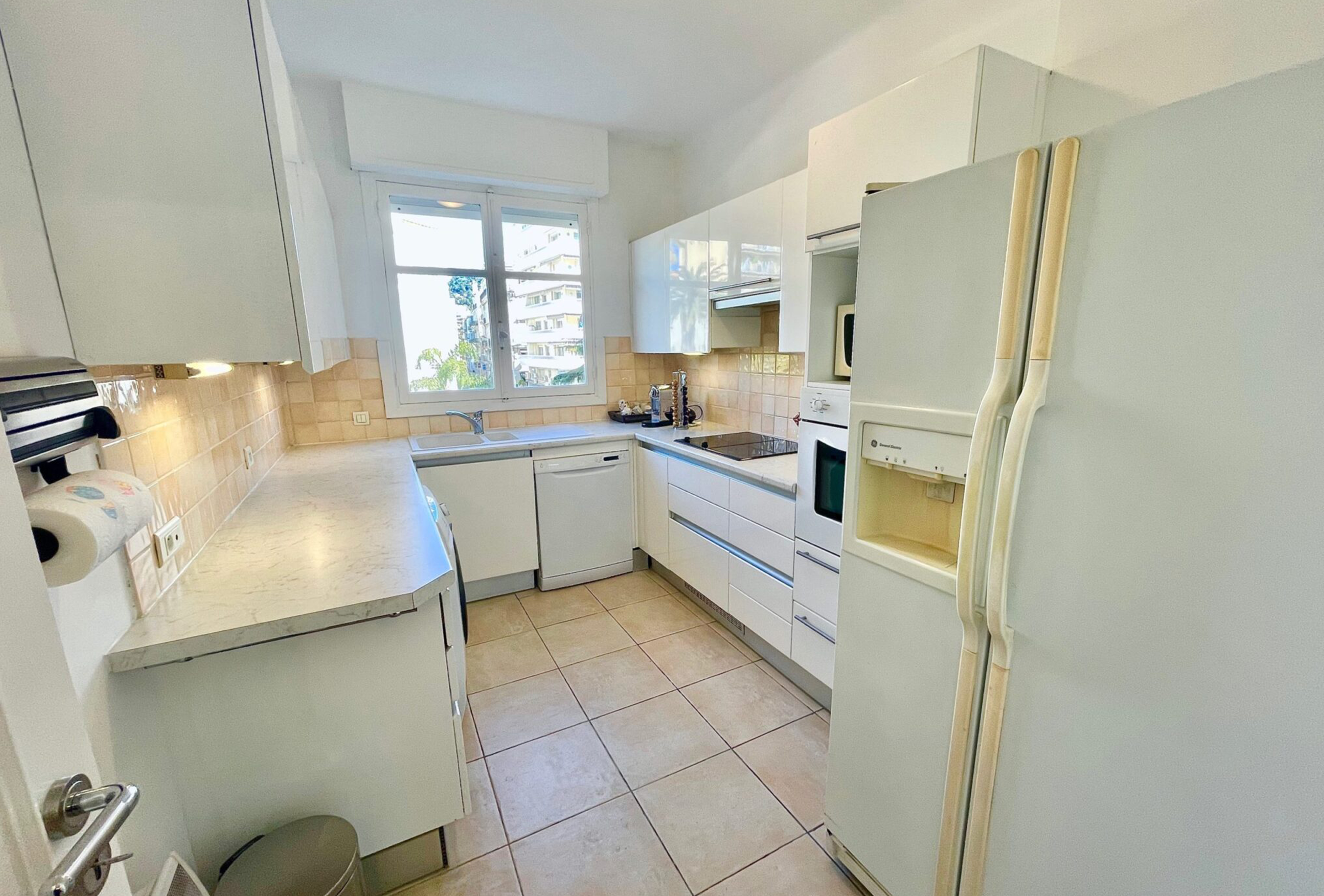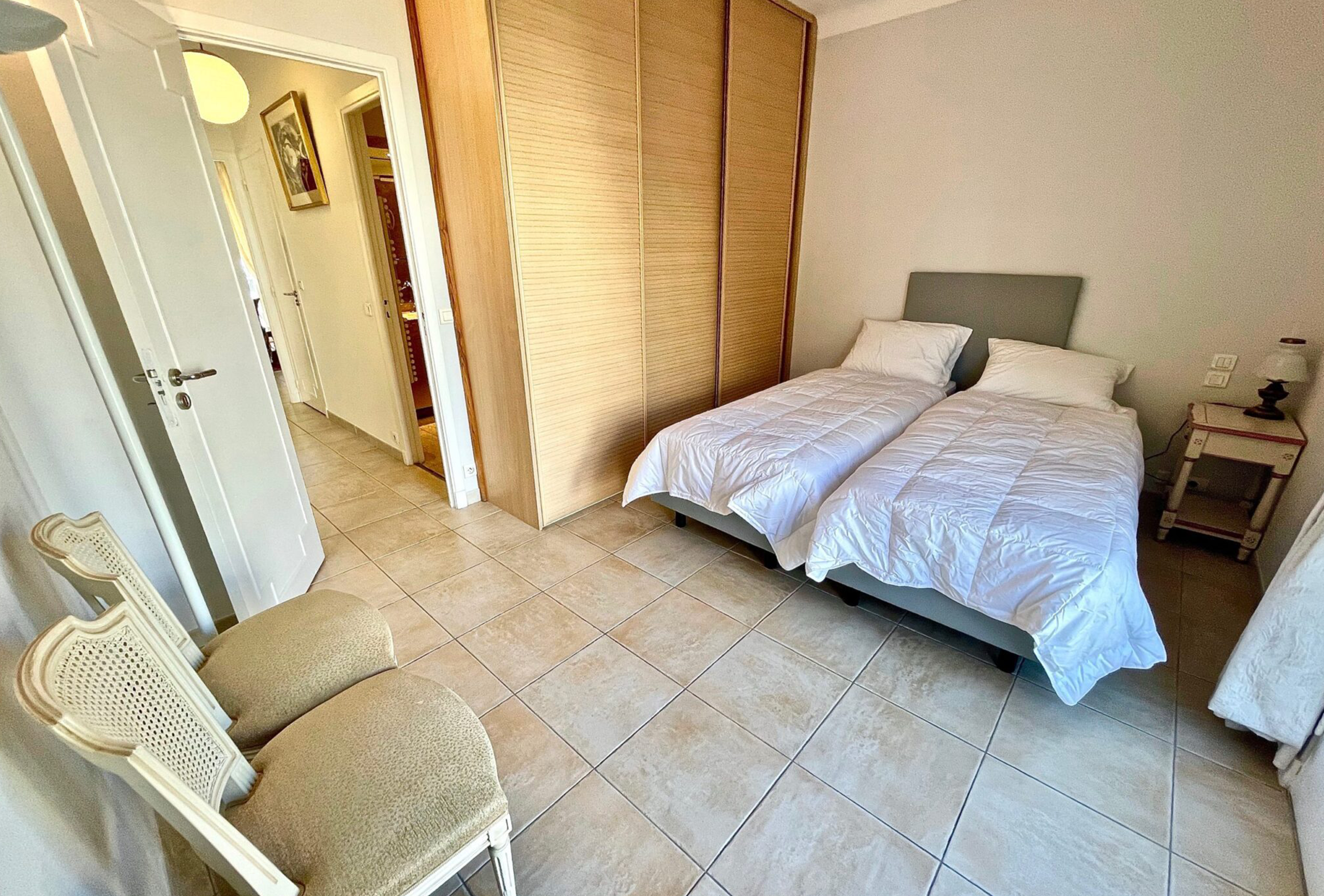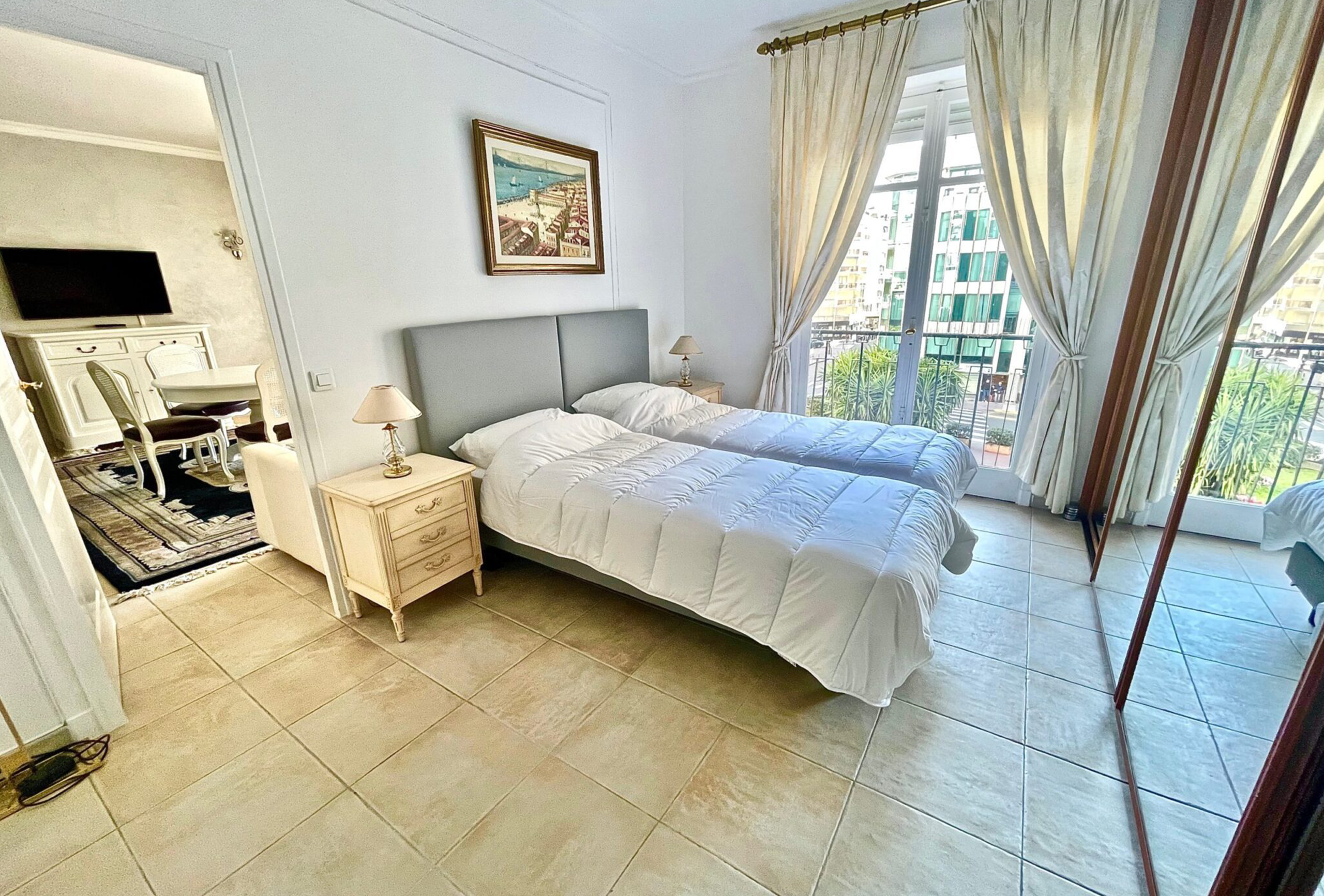 Spacious and clean 80sqm flat located in a high standard building behind the Marriott Hotel between la rue d’Antibes and the Croisette, 8min walk from Palais des Festivals and 200m from the beaches. Living room, fully equipped kitchen (ceramic hobs, oven, microwave, fridge freezer, dishwasher, washing machine…), two bedrooms with twin beds – possible to join them to make a double beds (2x80cm), one bathroom with toilet and one shower room with toilet as well, a nice terrace facing south, internet and air conditioning in the living room.