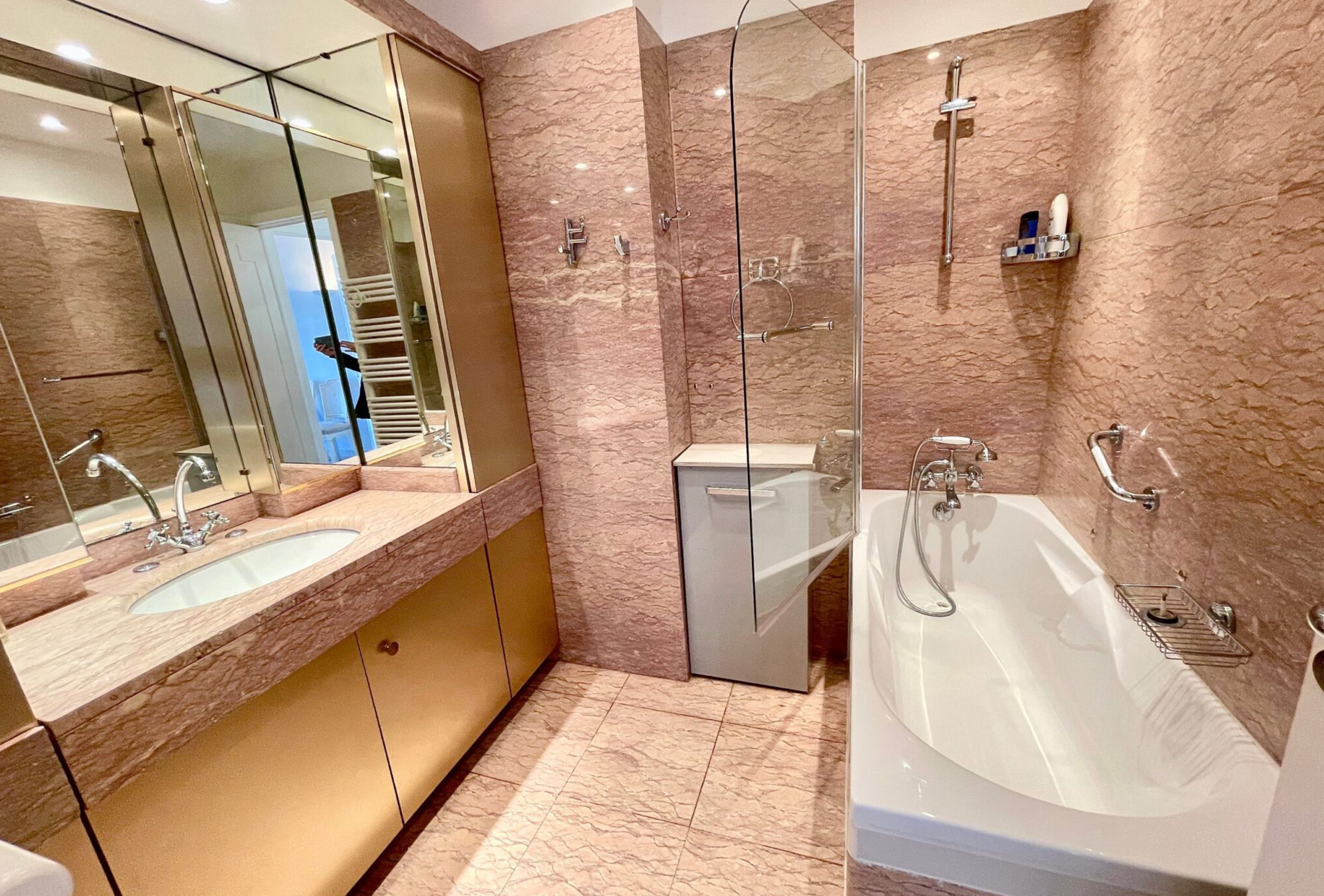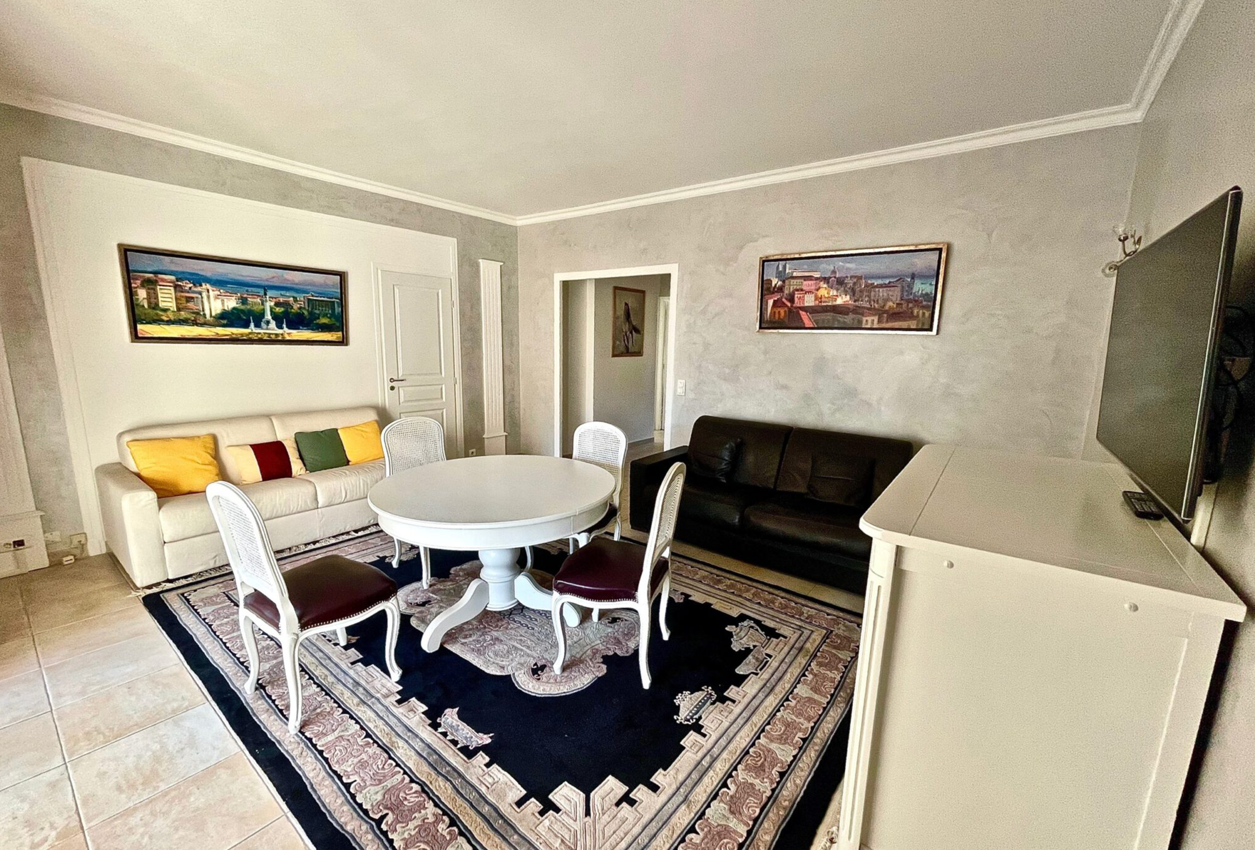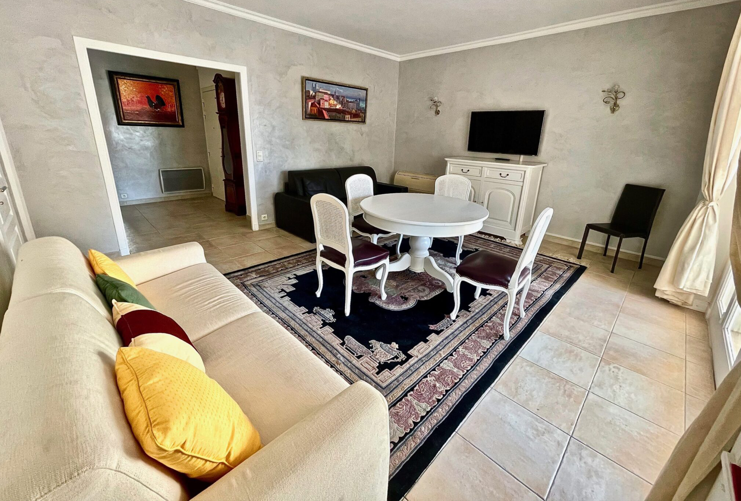 Spacious and clean 80sqm flat located in a high standard building behind the Marriott Hotel between la rue d’Antibes and the Croisette, 8min walk from Palais des Festivals and 200m from the beaches. Living room, fully equipped kitchen (ceramic hobs, oven, microwave, fridge freezer, dishwasher, washing machine…), two bedrooms with twin beds – possible to join them to make a double beds (2x80cm), one bathroom with toilet and one shower room with toilet as well, a nice terrace facing south, internet and air conditioning in the living room.