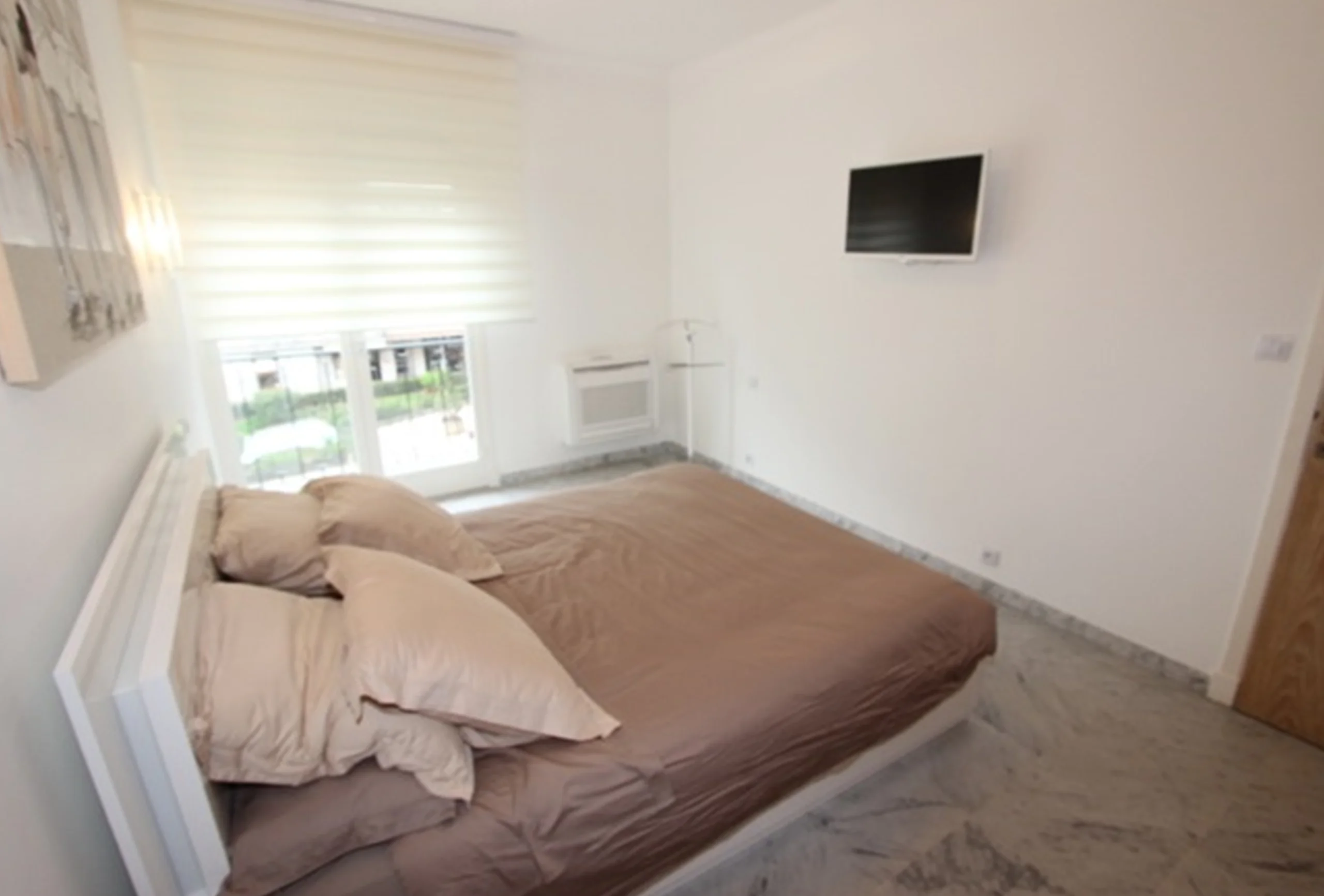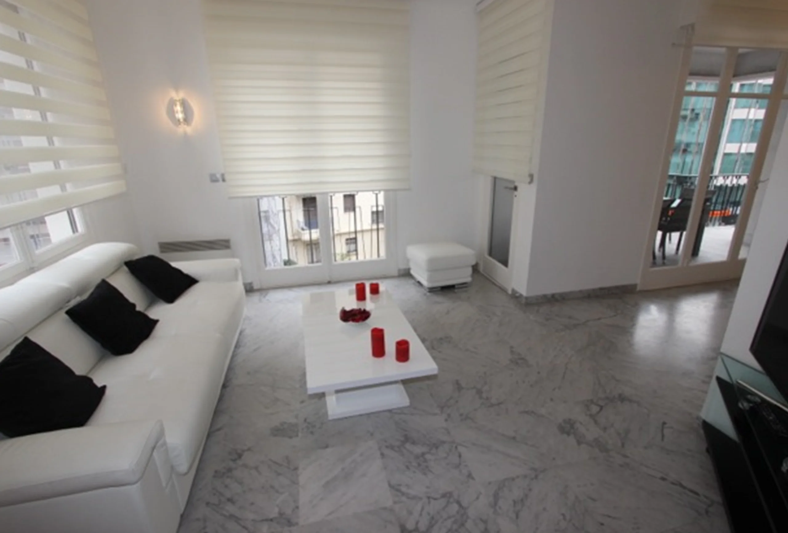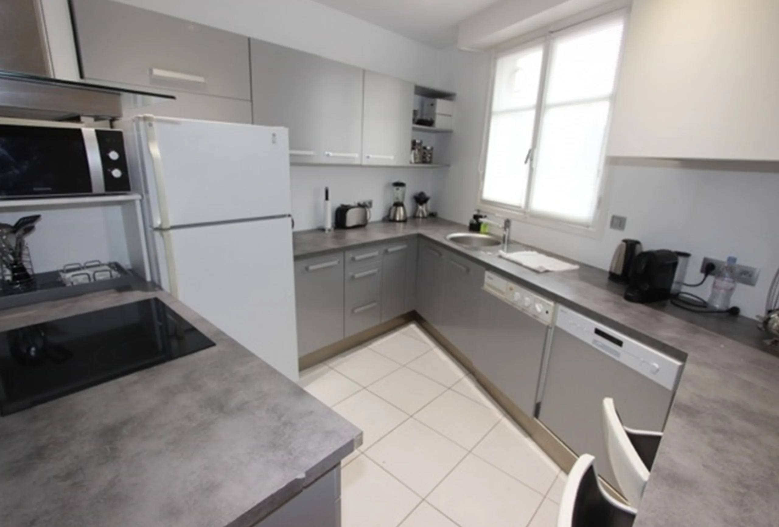 Nice two bedroom renovated of 80 sqm + terrace on the 2nd floor facing south/west. It includes an entrance, a living-room in L with a sitting area with a sofa bed and a dining area opening onto a furnished terrace, two bedrooms with double beds and TV (and possibility of one of them to add a single bed), a shower, a separate toilet, an equipped kitchen (oven, microwave, dishwasher, washing machine, plates , refrigerator, freezer …), air conditioning and internet.