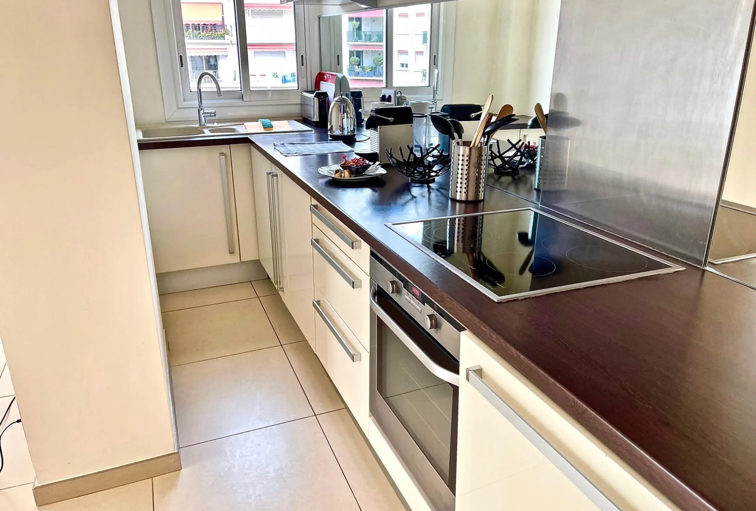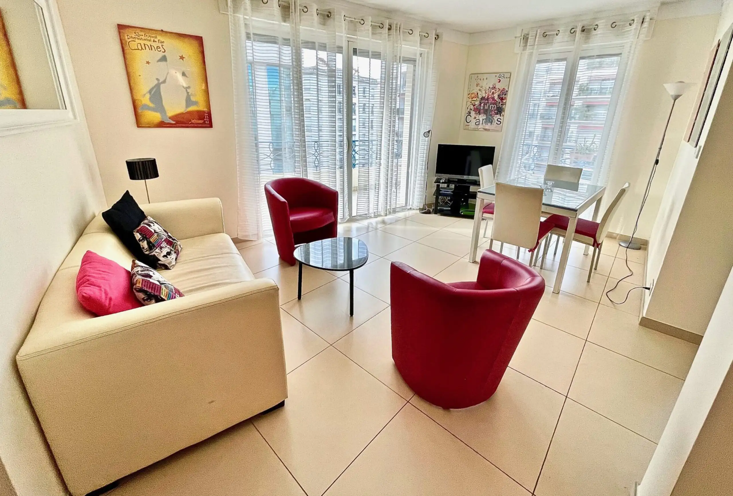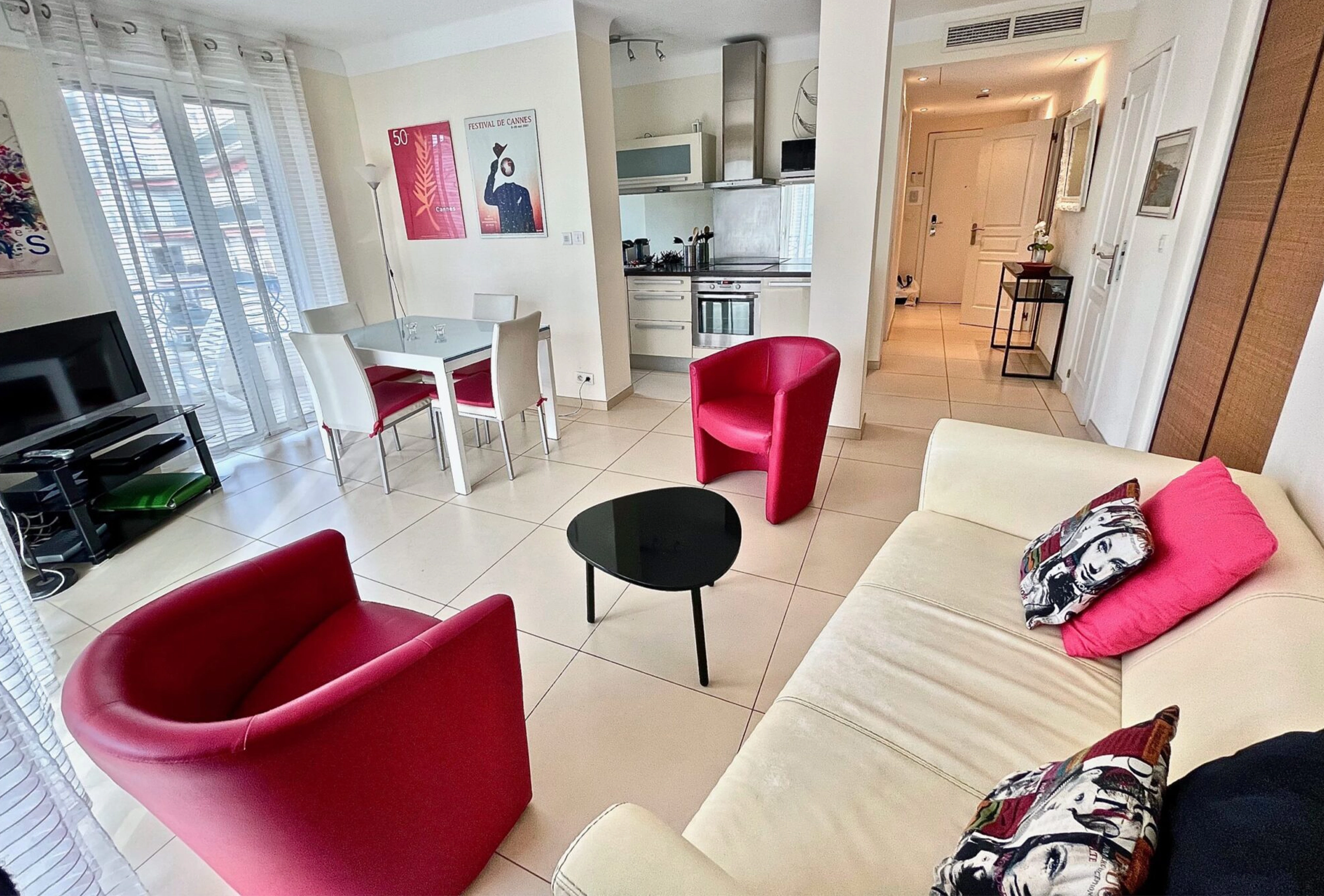 This is a residence located 100 meters from the adjoining Croisette at the Marriott hotel and 7 min walk from the Palais des Festivals. Luxurious 2 rooms of 60 m2 on the 4th floor with living room and open kitchen (hob, oven, microwave, fridge, dishwasher, washing machine …), two bedrooms with single beds and possibility of making double beds, a bathroom with toilet, a shower room with wc, a west facing terrace with sea view, air conditioning, centralized electric shutters and internet.