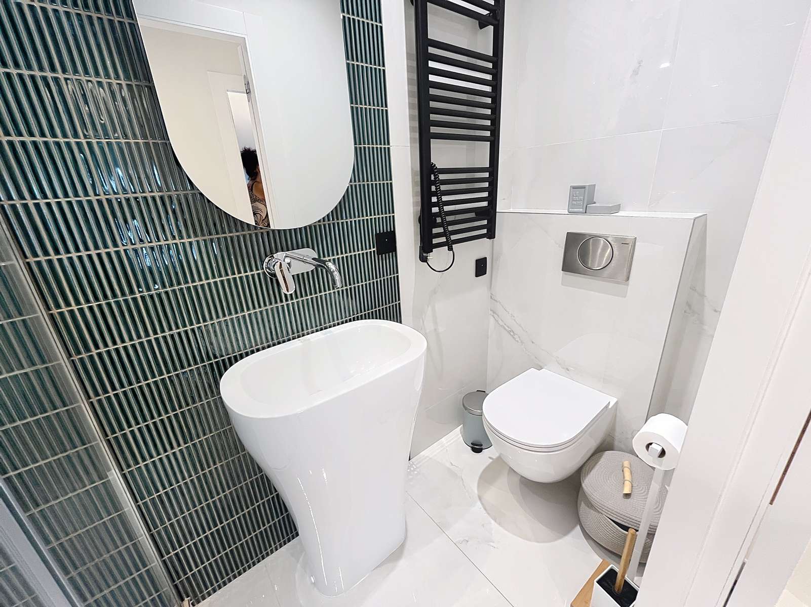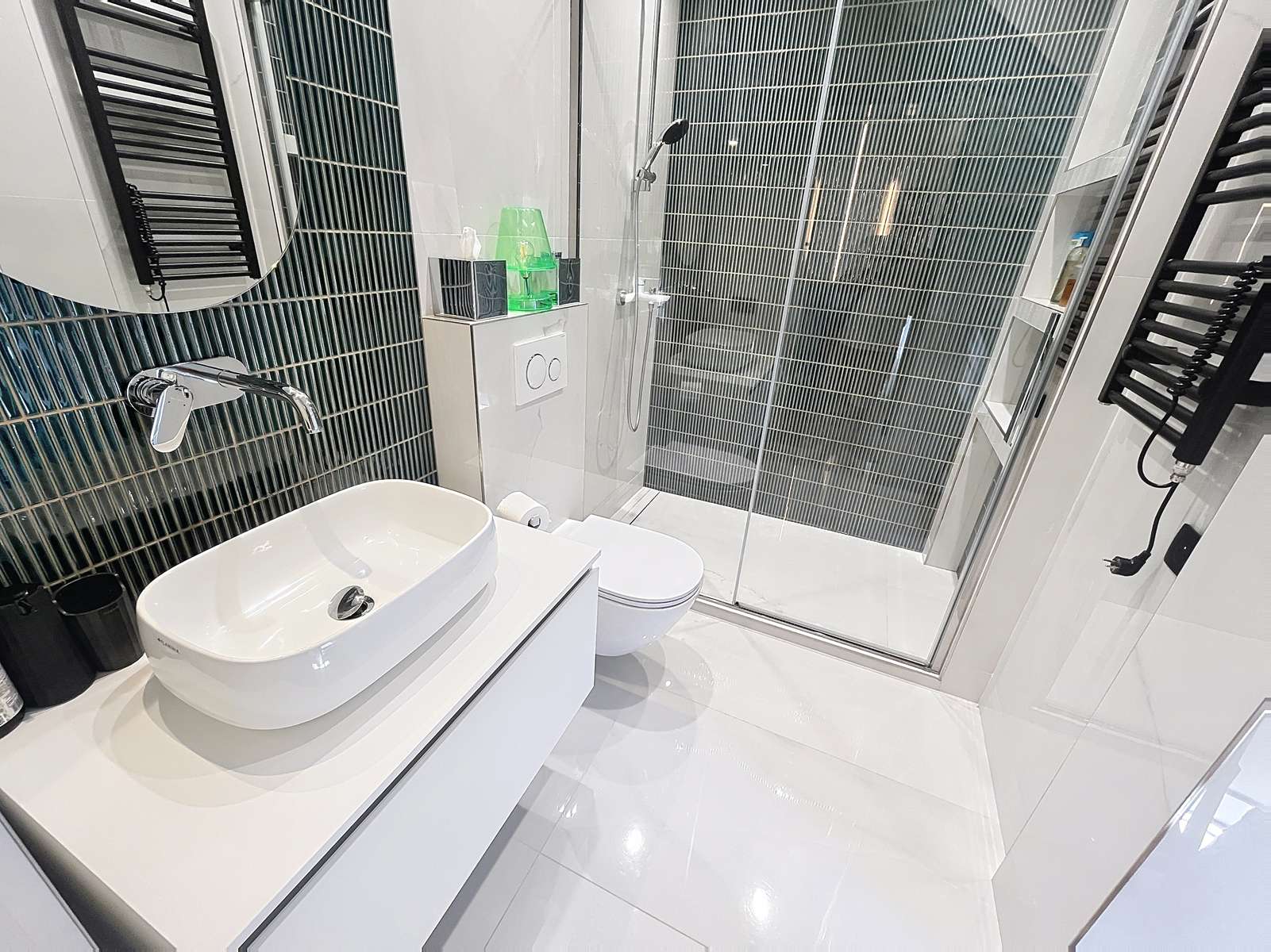 The penthouse offers three elegant bedrooms—two with double beds and a master bedroom featuring a double bed and an en suite bathroom with shower and toilet. An additional bathroom with shower and toilet ensures comfort for all guests.