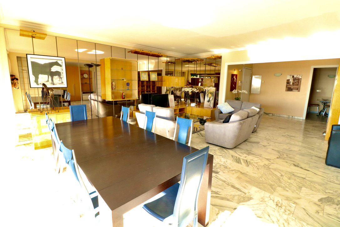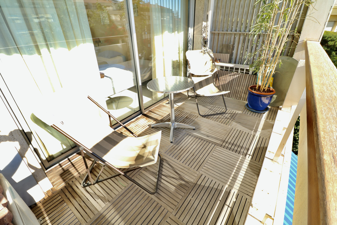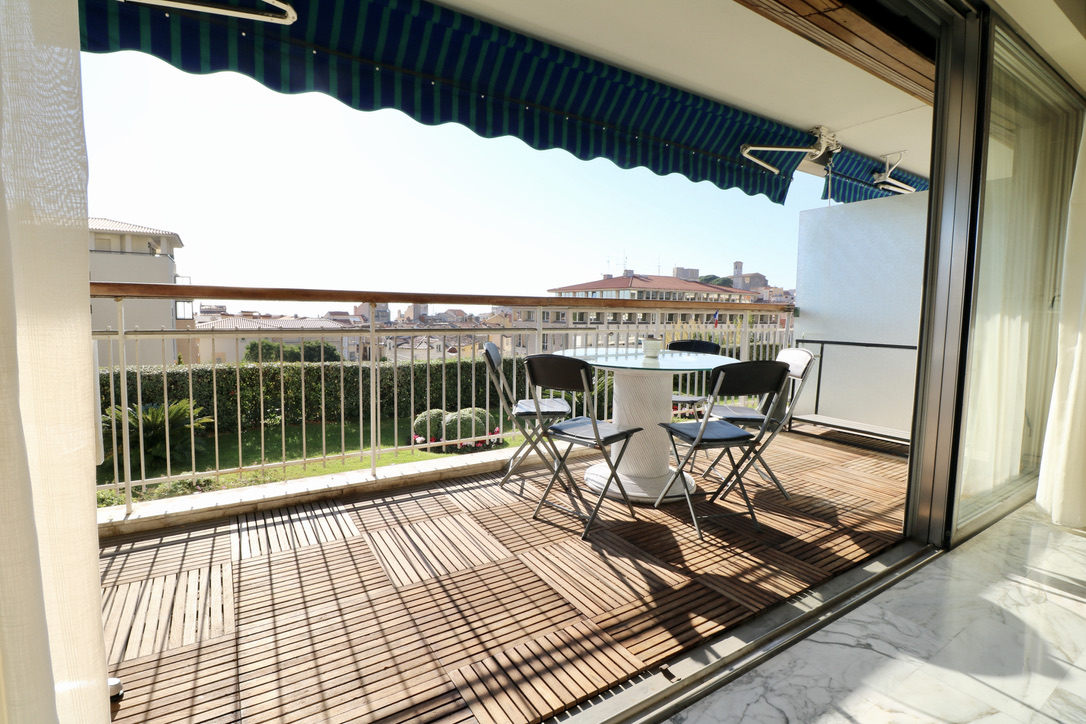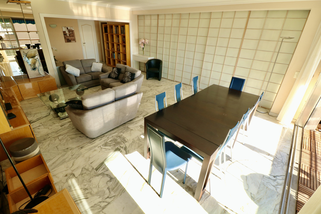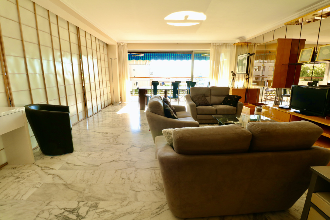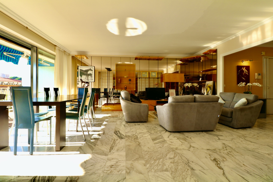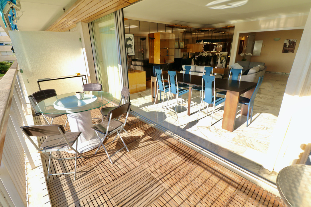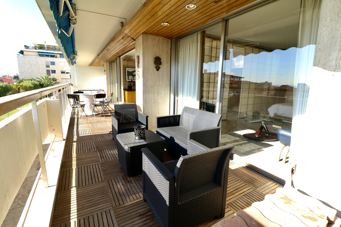 Living room widely open on a huge balcony. South exposure, little sea view.