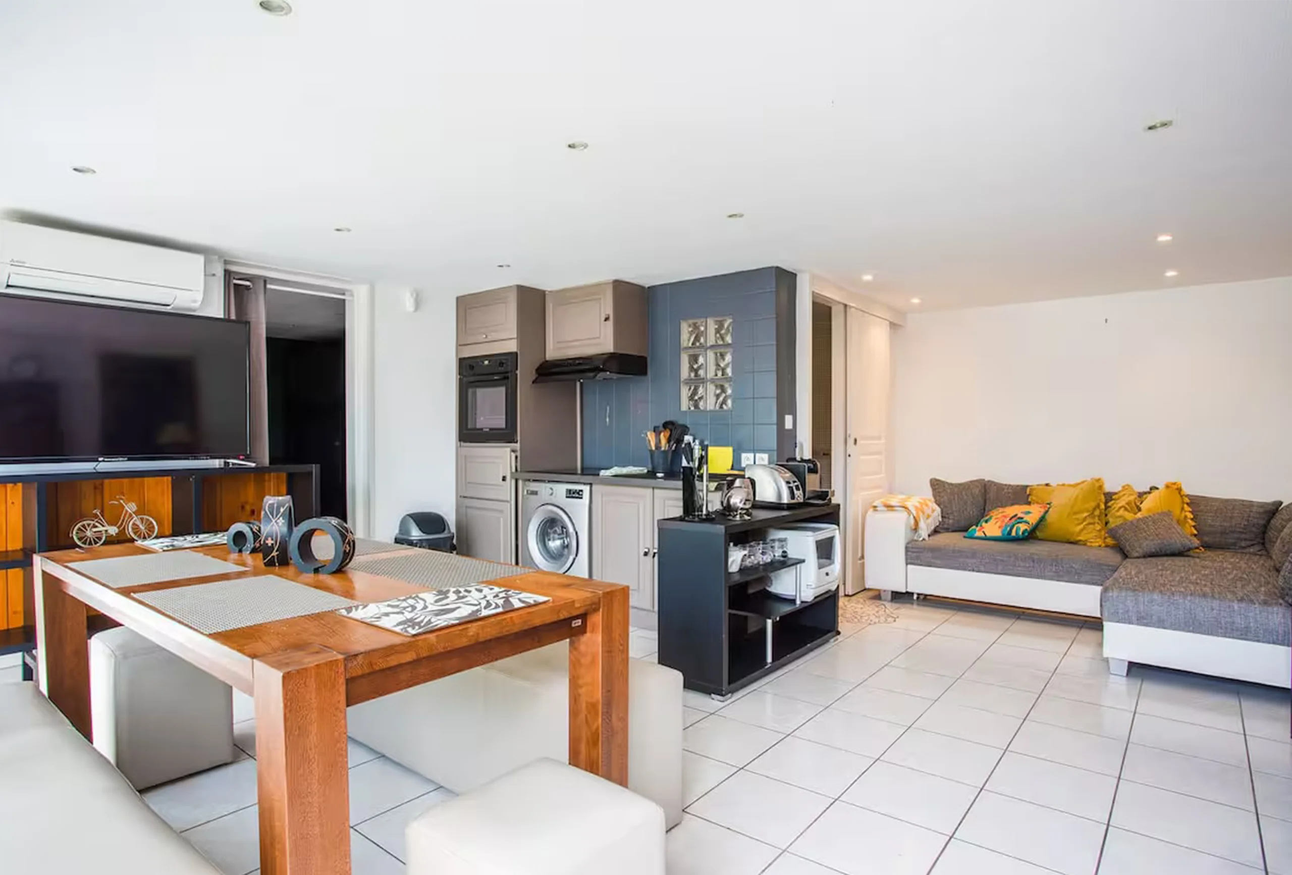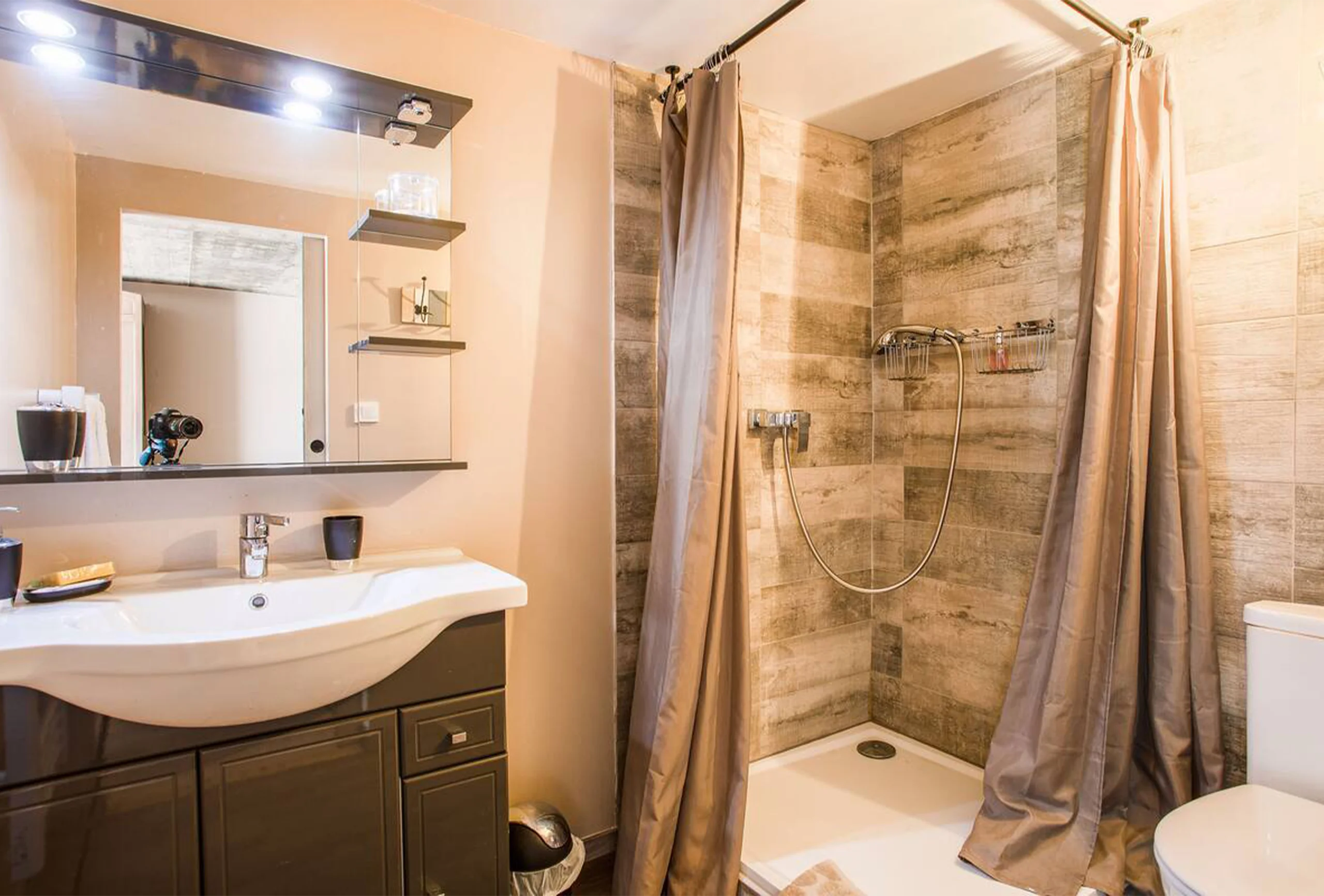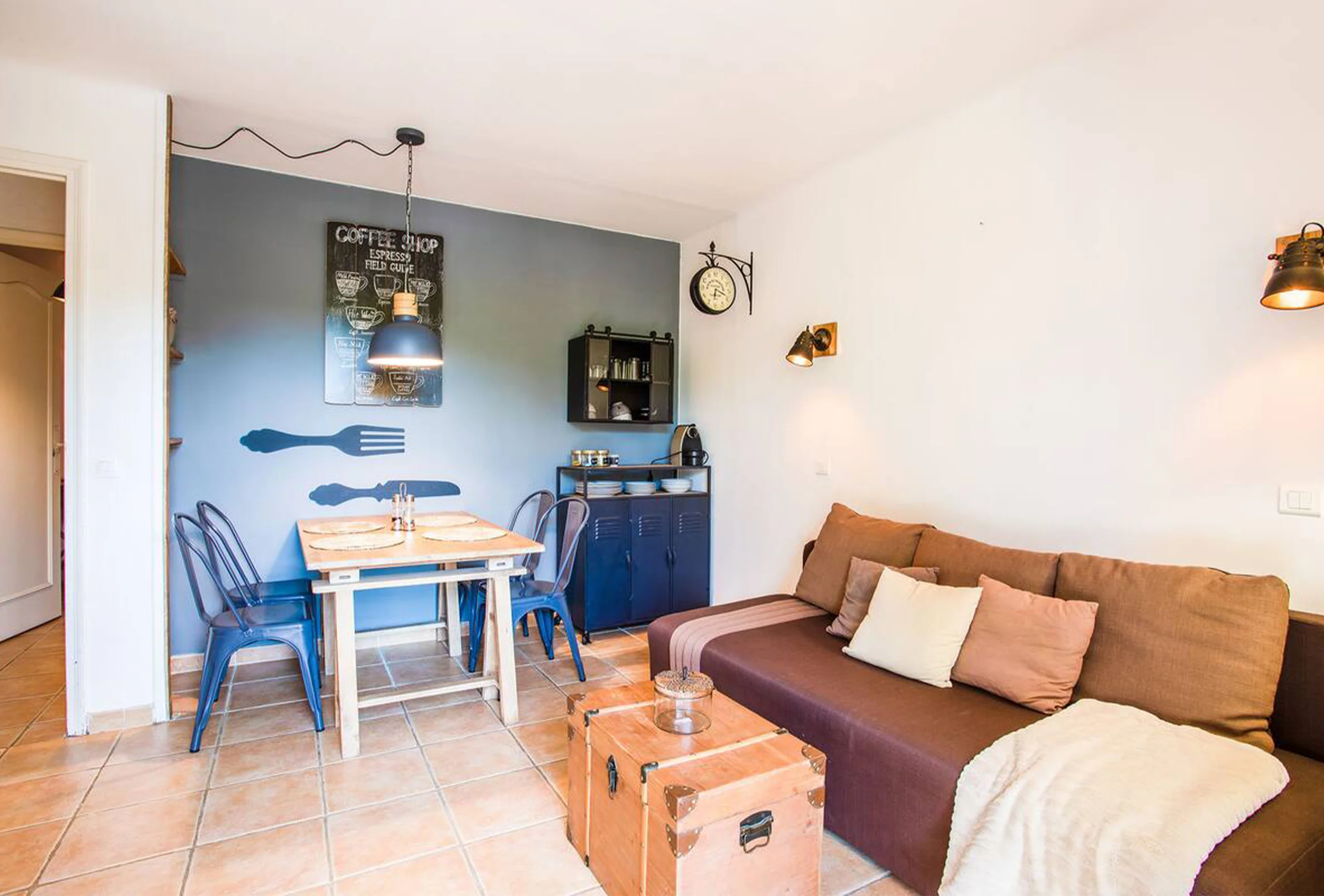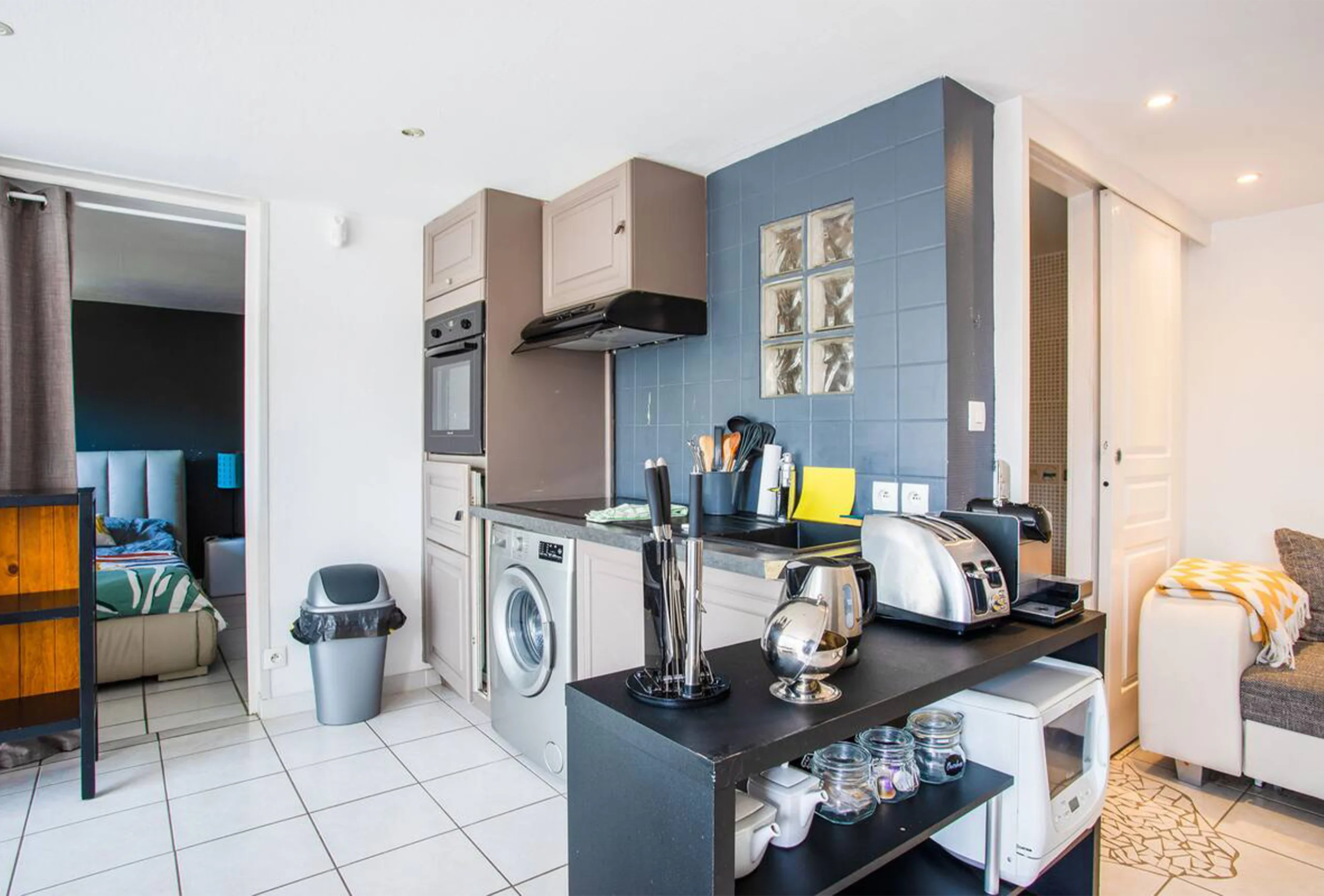 – On the garden level, 5 apartments equipped either in studio or in 2 rooms each sleeping 2 people and a bathroom with wc in each, a large terrace along the property. A beautiful swimming pool, a landscaped garden with barbecue area, sun loungers and patio furniture in front of each apartment.