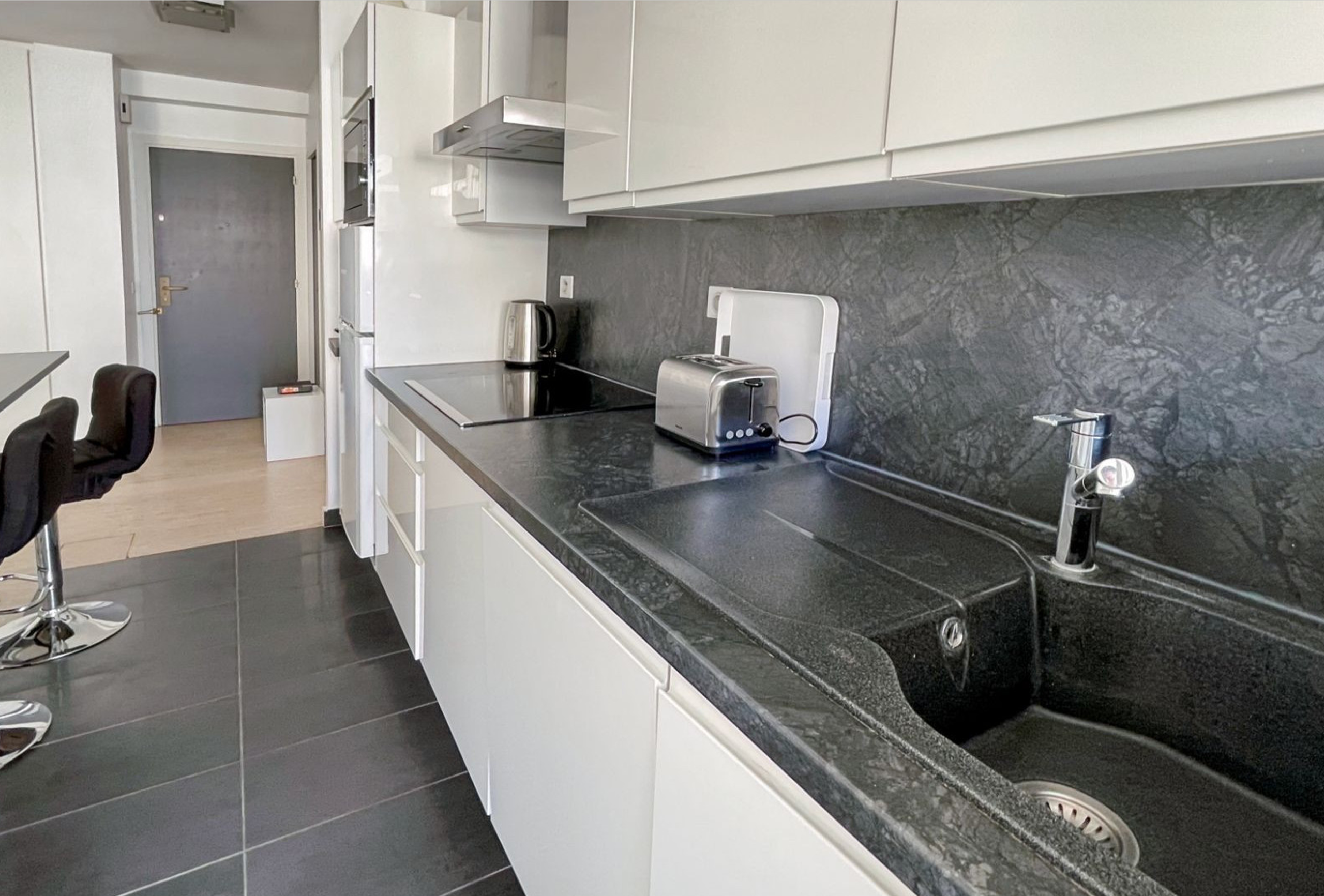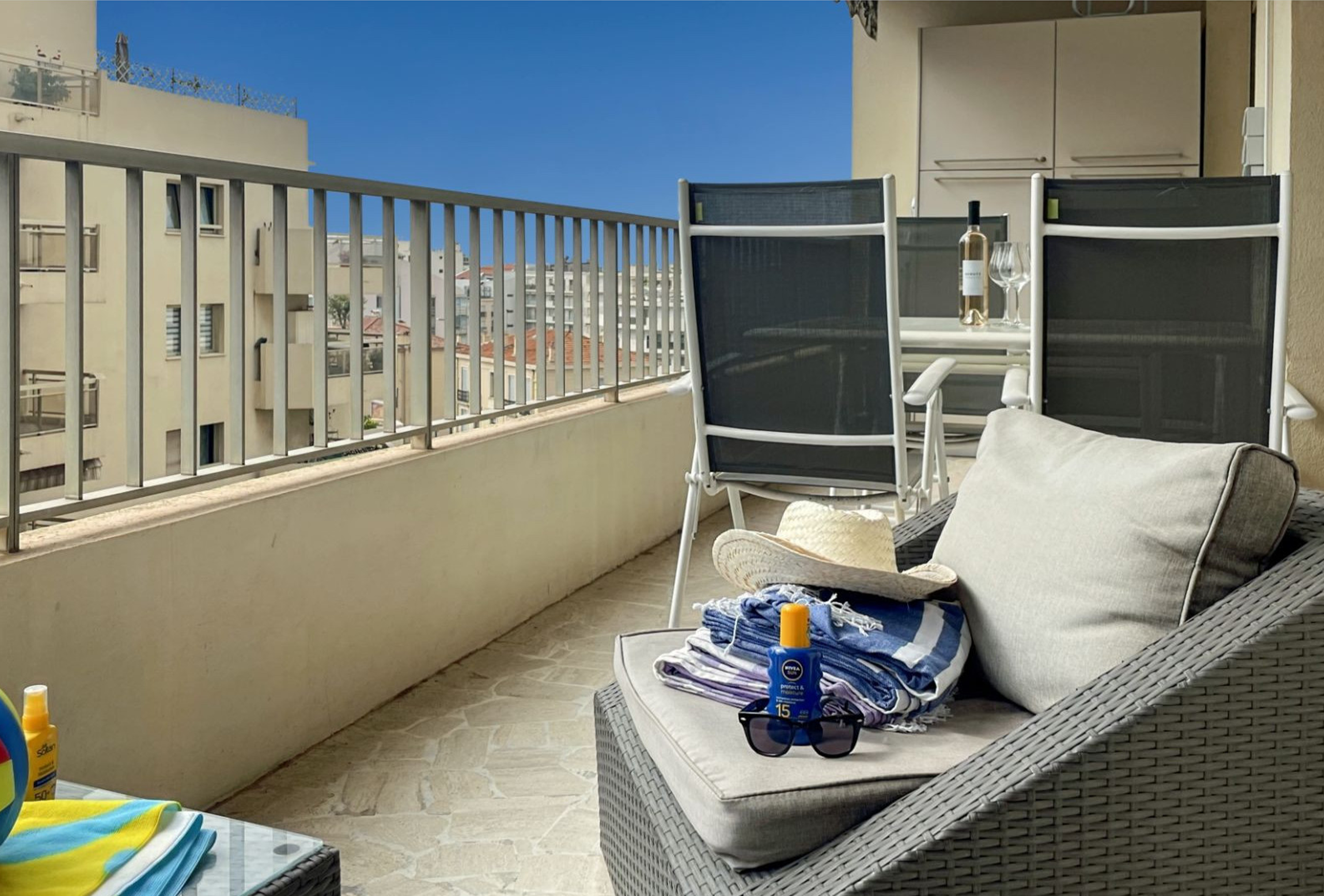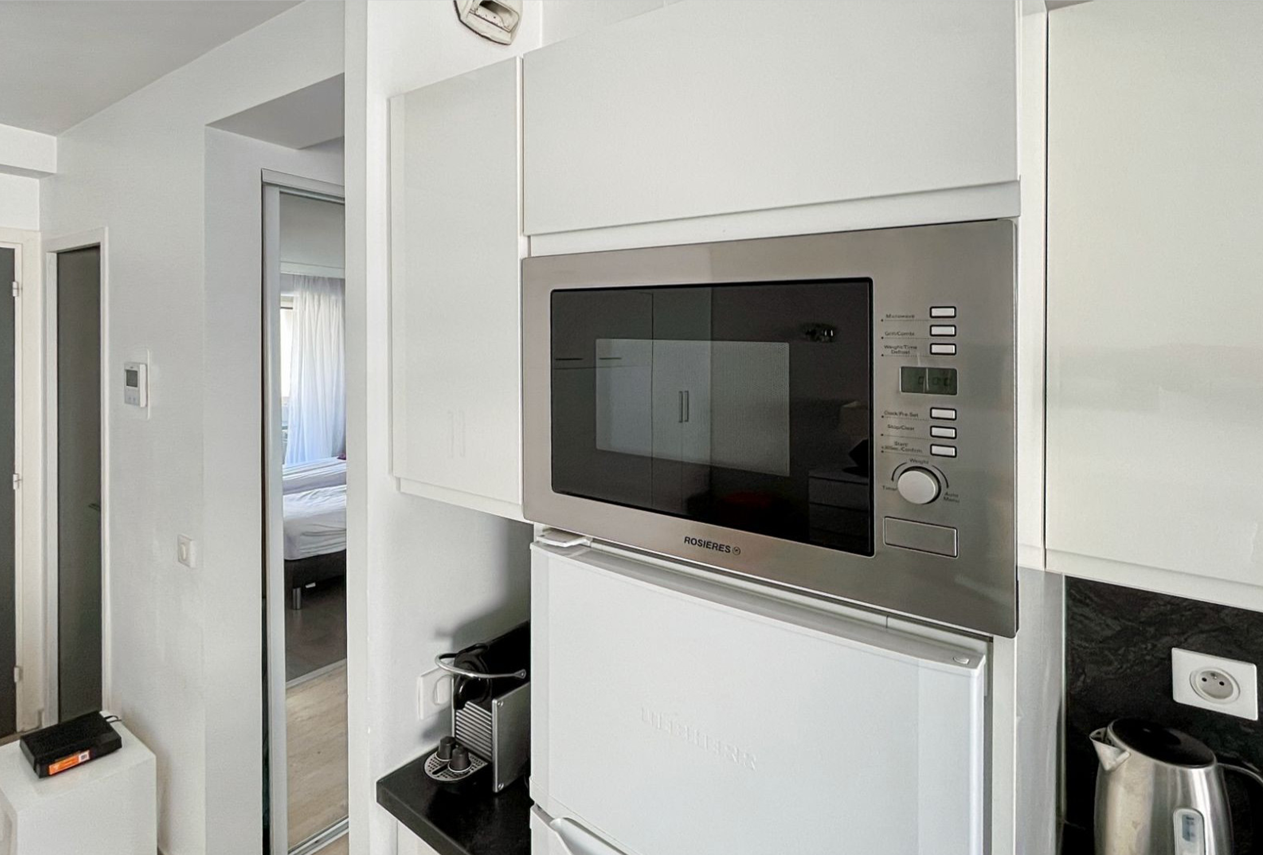 This elegant apartment, bathed in natural light, offers an exceptional experience in Cannes. Featuring a large terrace with partial sea views, this apartment can accommodate up to four people. You will first discover a spacious living room, equipped with a flat screen and a foldaway bed for two people. The fully equipped American kitchen invites you to prepare your favorite dishes with modern appliances such as microwave, refrigerator, coffee maker, kettle, toaster and dishwasher.
