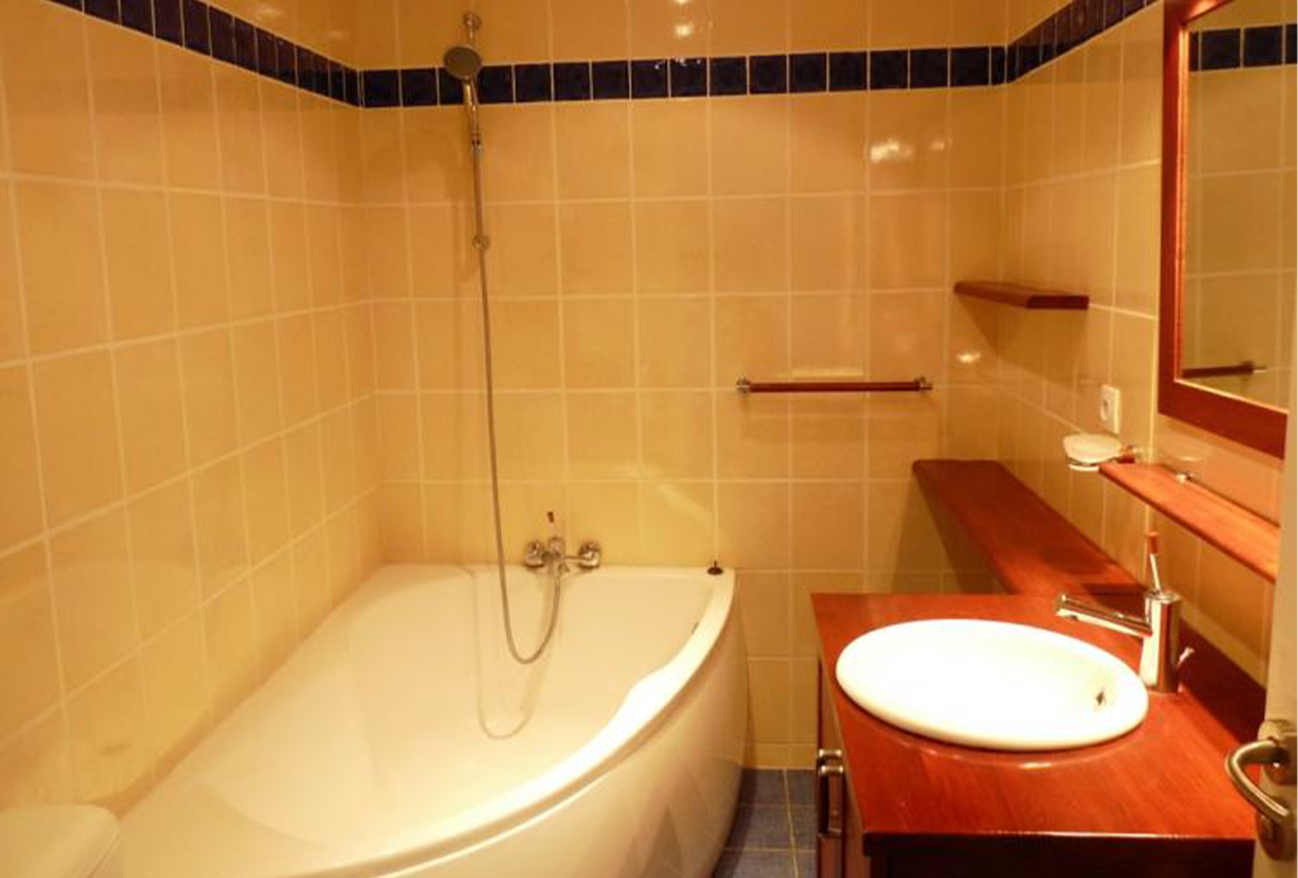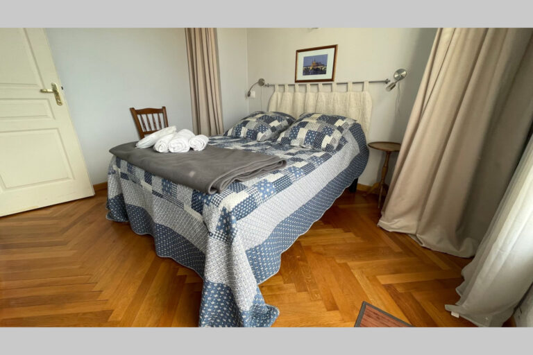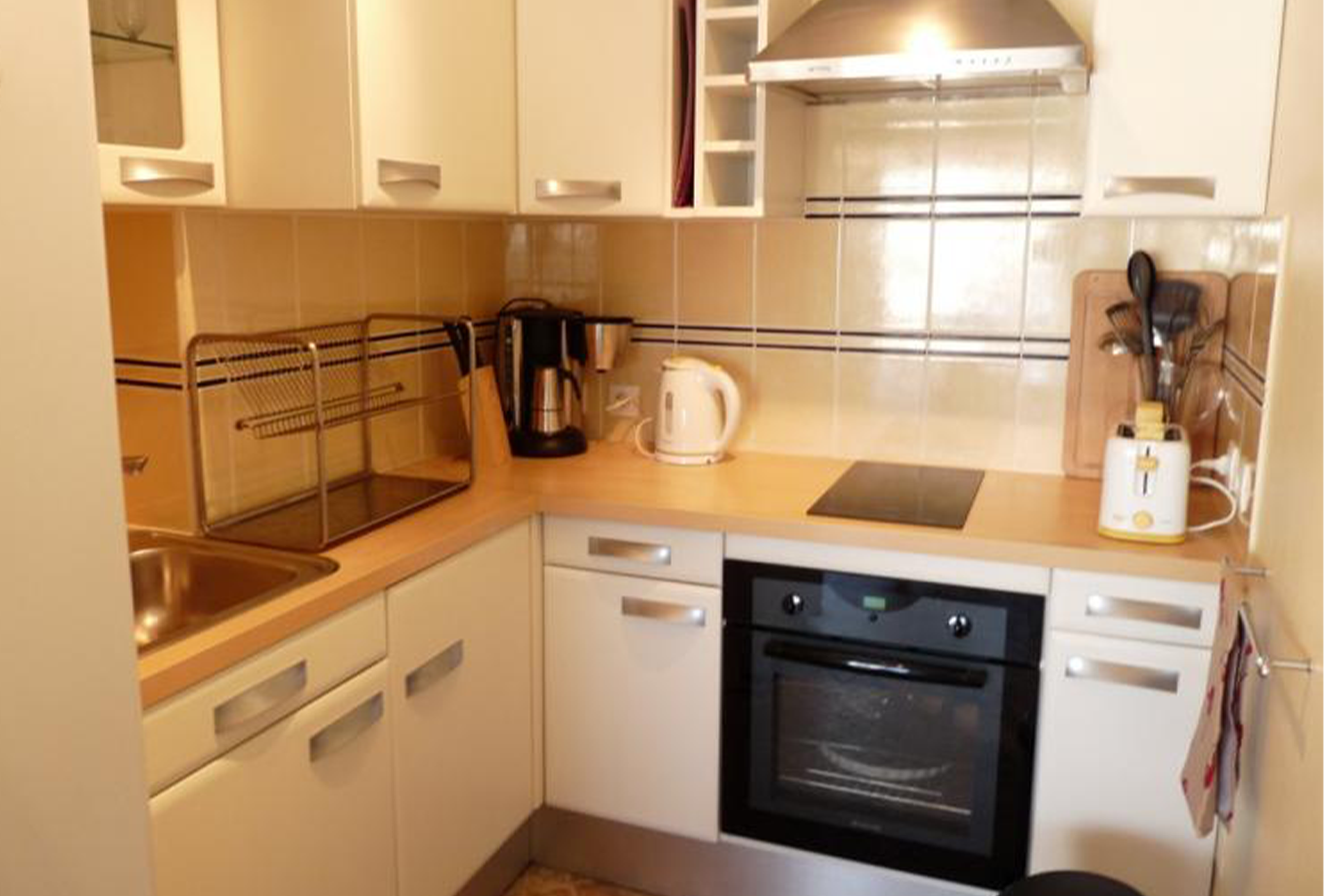 The hallway opens up into the open plan living area. The apartment is cosy, modern and very welcoming. There is a large leather sofa from which to watch a large, flat screen TV and wall mounted DVD player. There is a dining table located just next to the kitchen. The kitchen is modern and well fitted with terracotta tiled floors, hardwood floors and modern oven and fridge freezer. It has everything you need to make great meals for yourself and fellow guests.