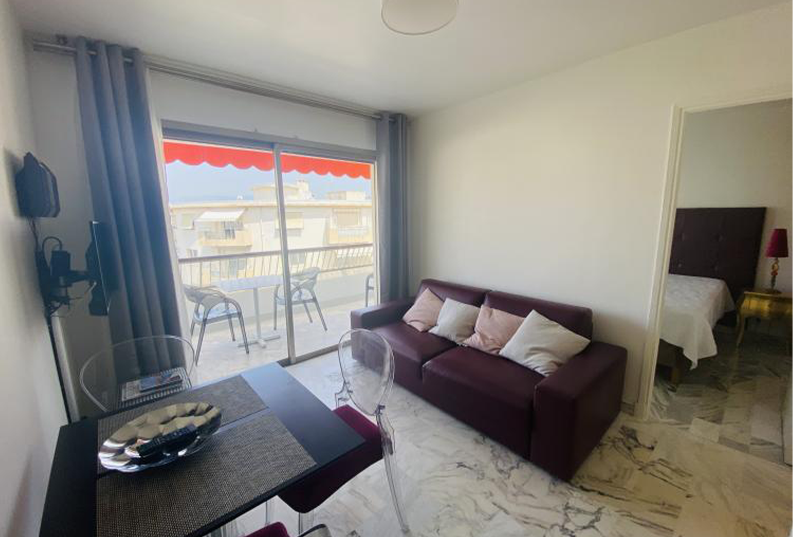 Fleuris Purple is a lovely 44m2 one bedroom, one bathroom apartment located in the centre of Cannes. Just off the Croisette and close to the beaches, it is perfect for congress attendees and holiday makers alike. The Palais is only a short walk down the Croisette and it is very simple to catch one of the buses up and down the Croisette for an extra speedy arrival at the Palais des Festivals. On entering the apartment you walk into the hallway that leads off to the bedroom and bathroom.