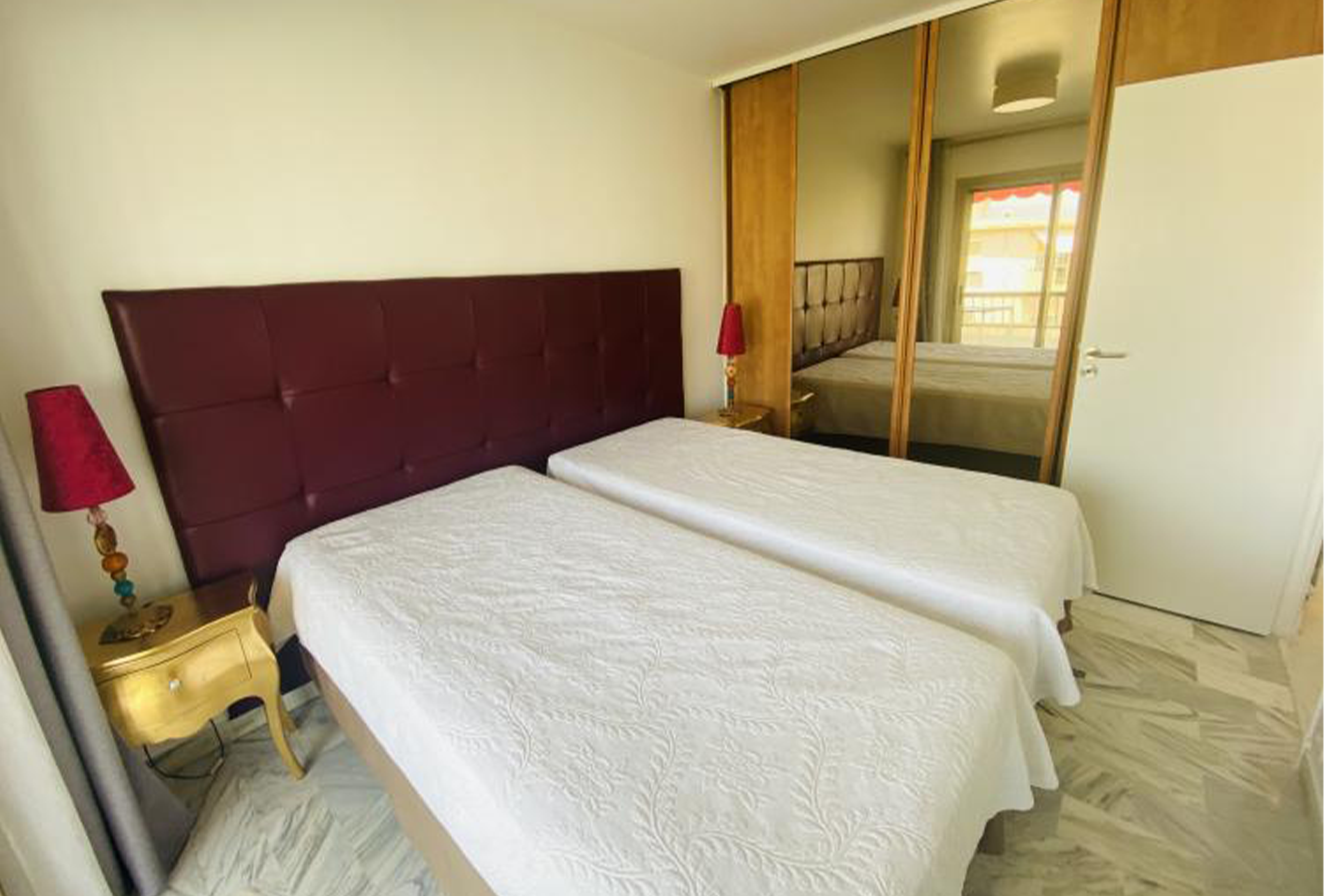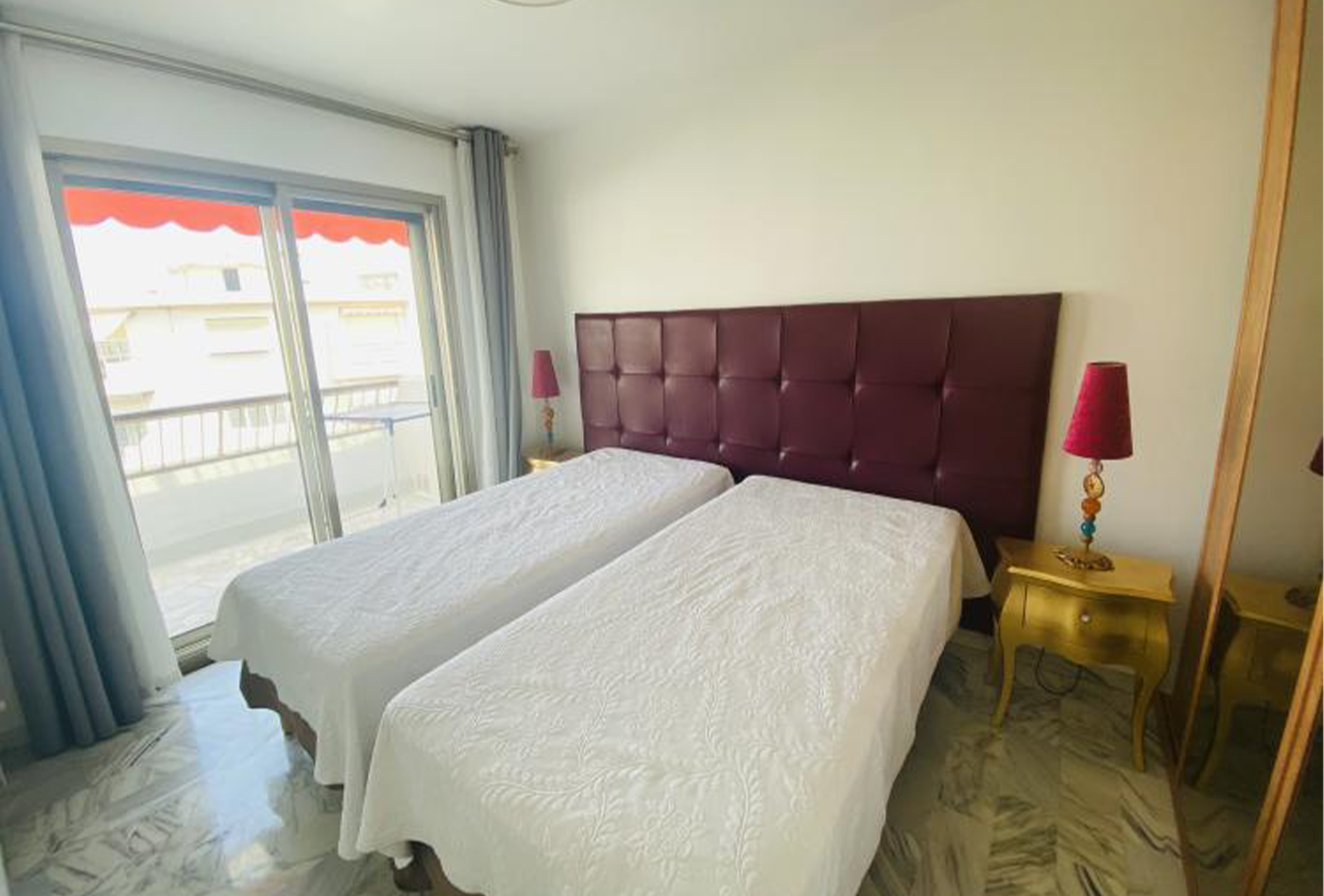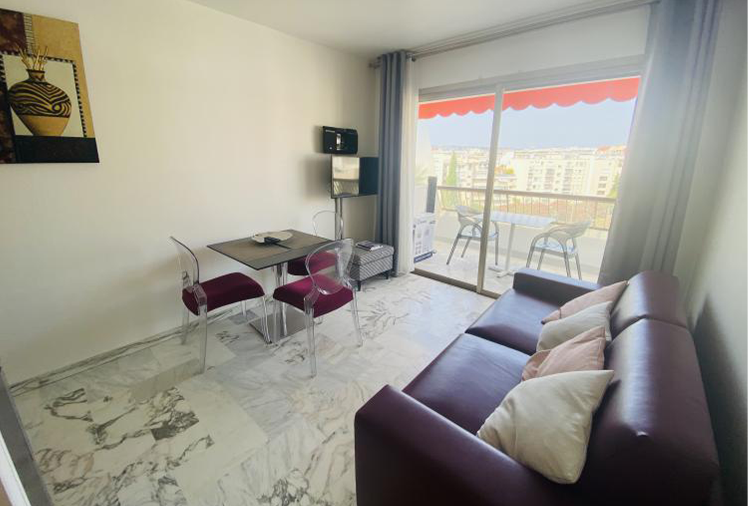 There is direct access from the living area onto the 12m2 terrace, making it a great option for al fresco dining. The terrace is large with lovely views up into the hills surrounding Cannes. There is comfortable seating for 4 people on the terrace. There is a private parking for this apartment.