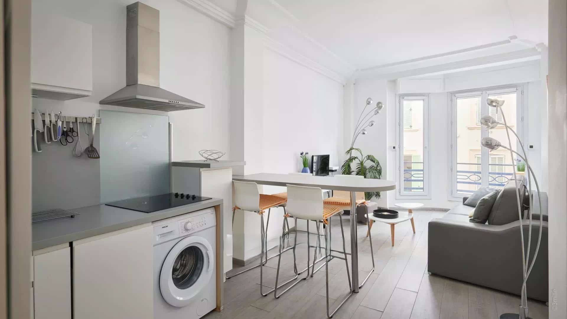 The large living and dining area is flooded with natural light and includes a comfortable sofa bed and a flat-screen TV, creating a friendly space to rest or entertain guests. The open, fully equipped kitchen features a bar with four chairs, an ideal spot for a quick breakfast or casual meals.