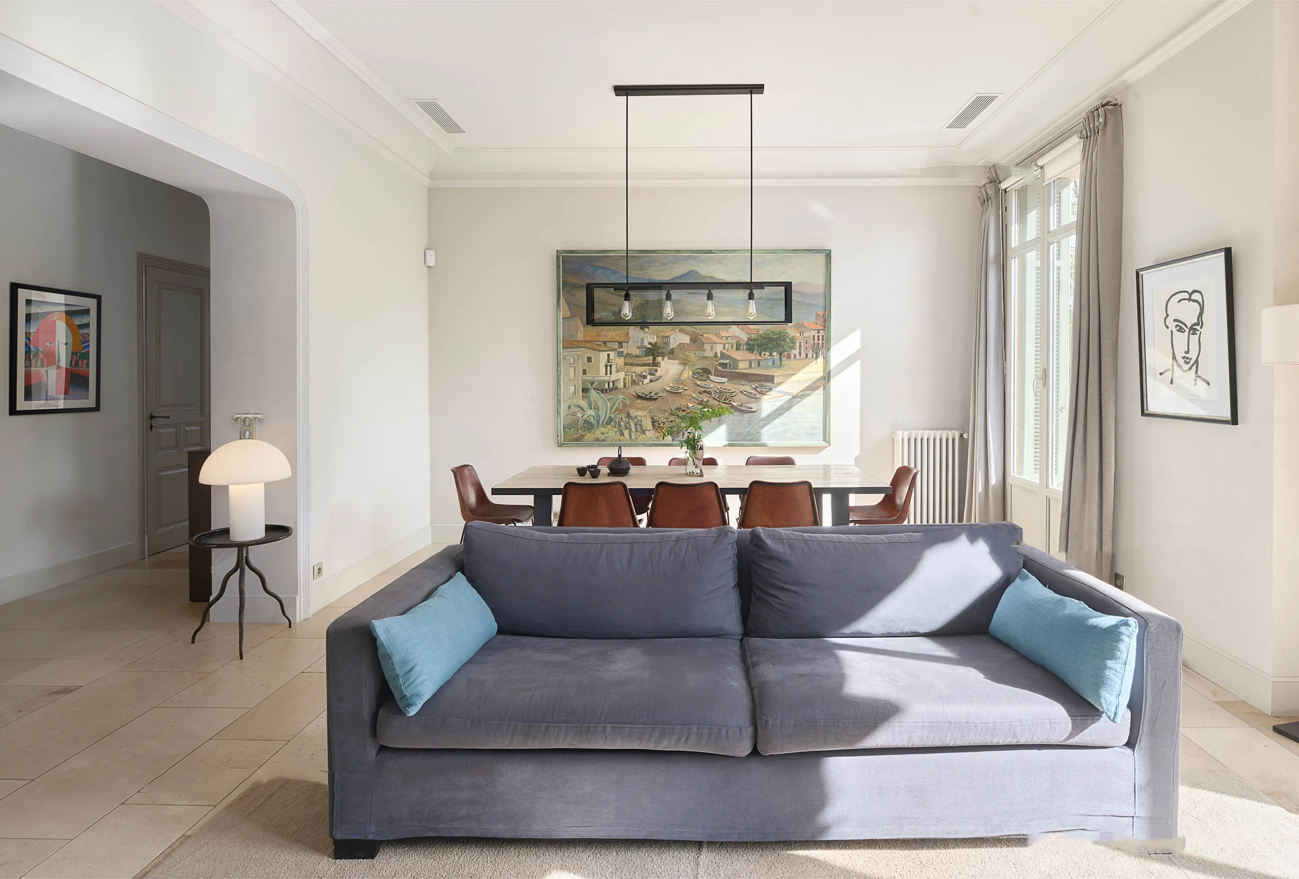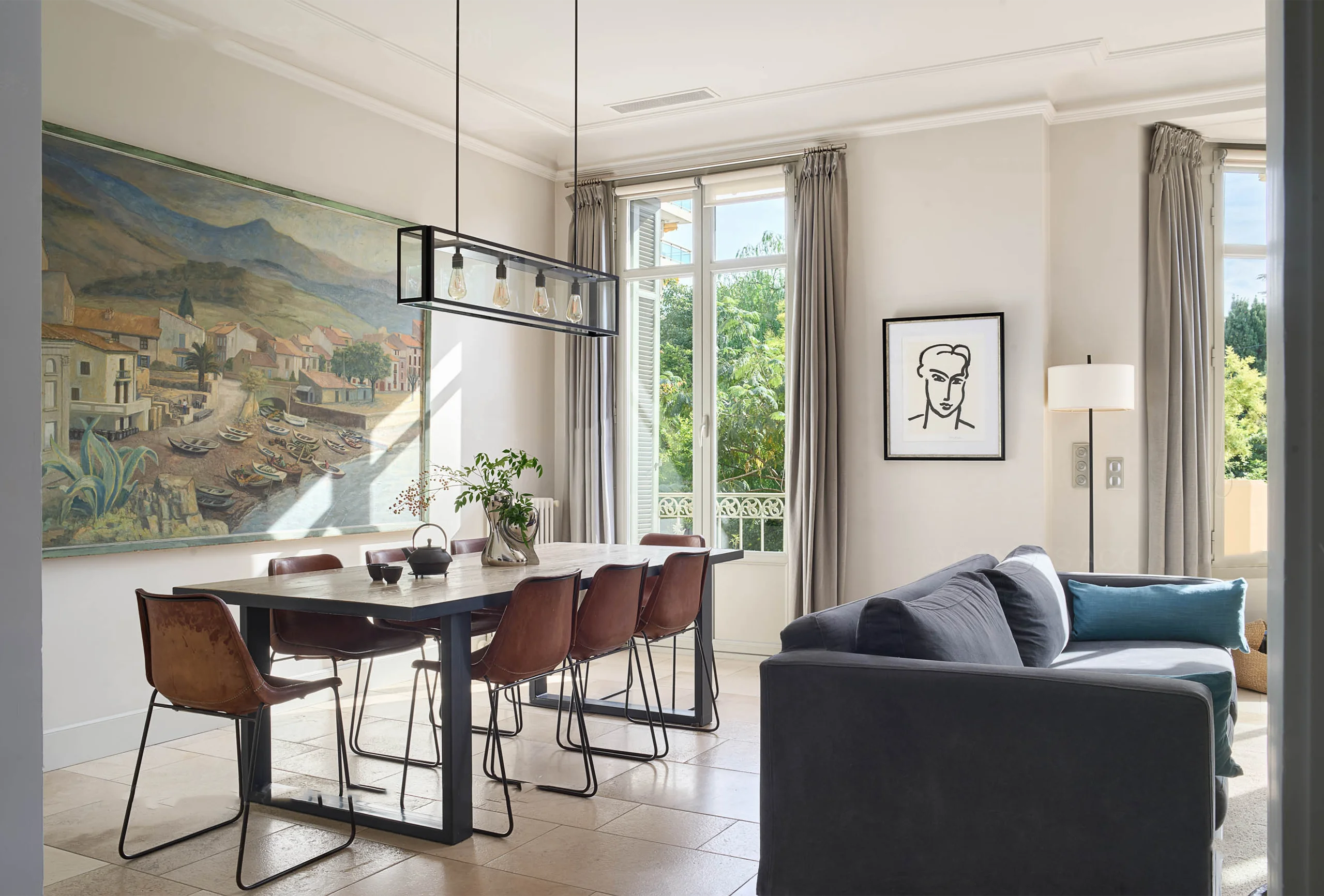 Nestled in a quiet and green neighborhood of Le Cannet, this 215m² townhouse, carefully renovated, embodies the perfect balance between timeless charm and modern comfort. Its delicate moldings, warm wooden floors, and light-filled spaces create a soothing ambiance, ideal for unwinding after a busy day on the Croisette. Just a few minutes’ drive from the iconic beaches of Cannes, this home offers the rare privilege of proximity combined with the intimacy of a peaceful setting. Whether you are a delegate seeking tranquility after an intense day or a tourist looking for a luxurious escape, this property is a perfect retreat.