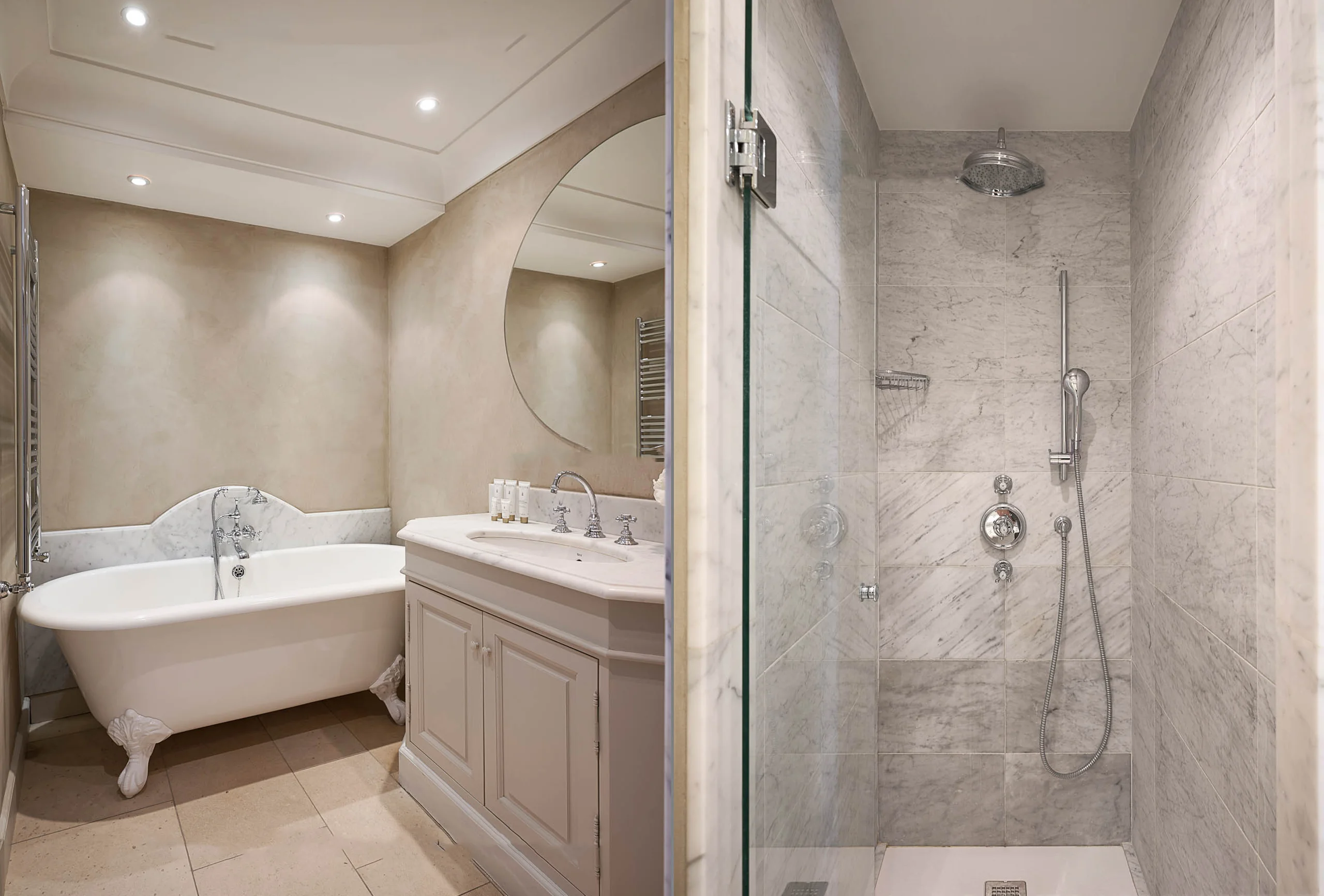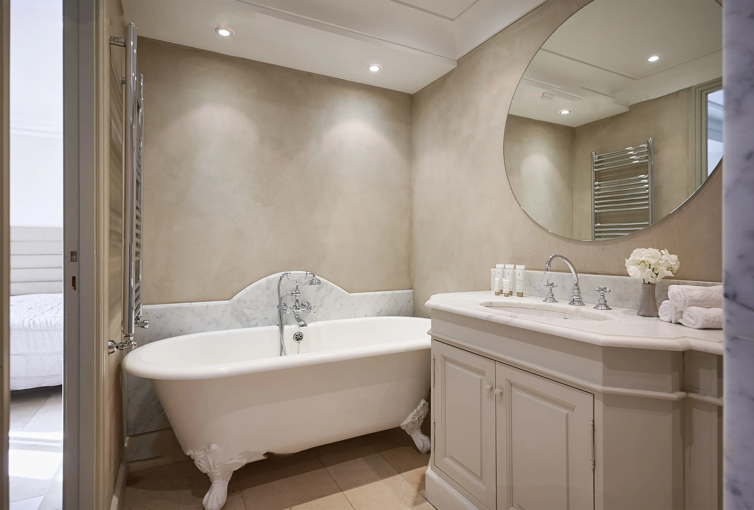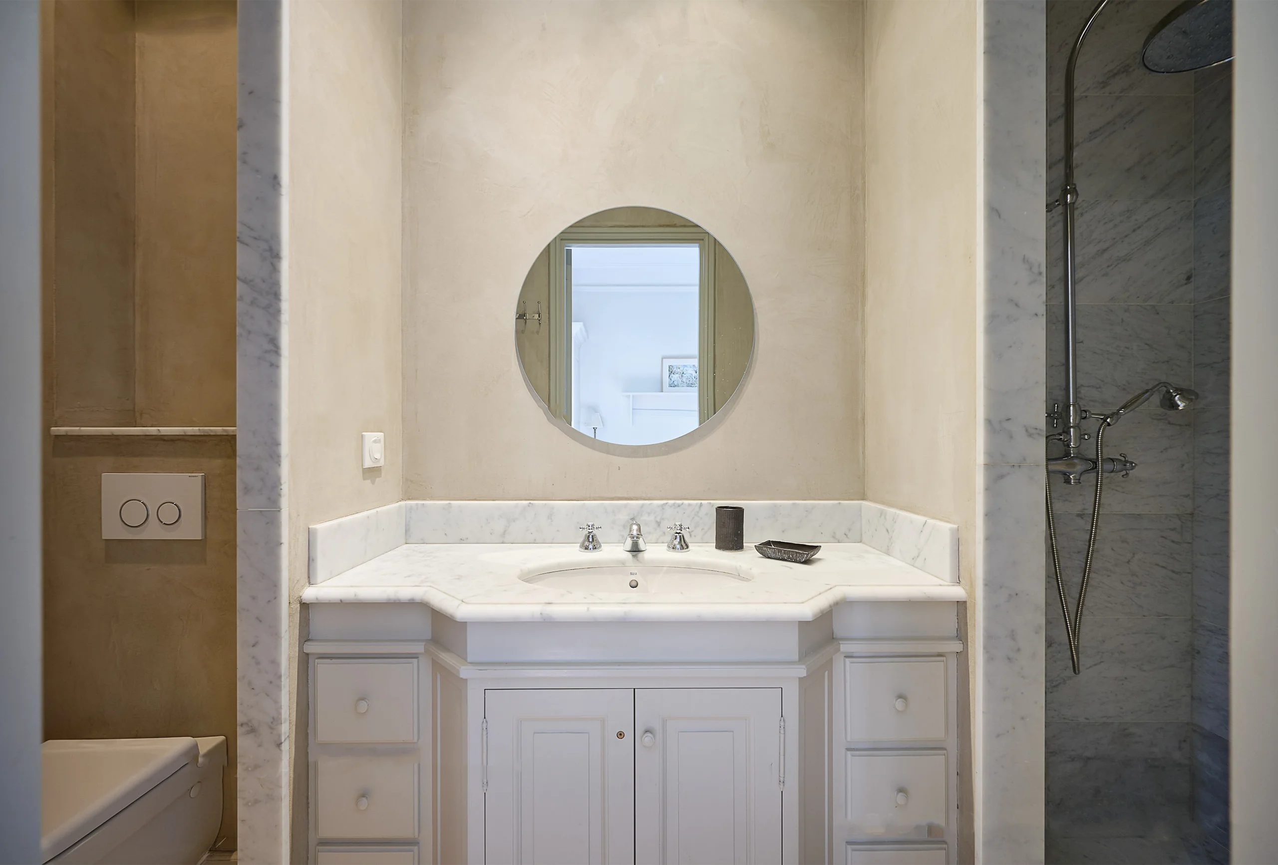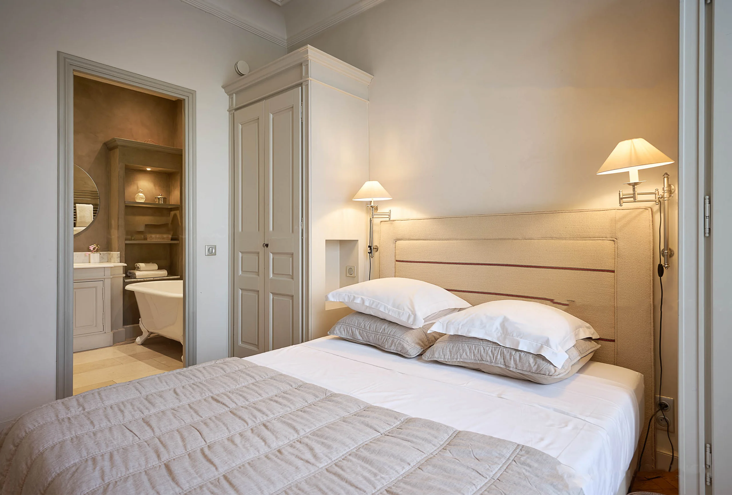 – Bedroom 1: An elegant suite featuring a queen-size bed (160 cm), built-in storage, an en-suite bathroom, and WC.