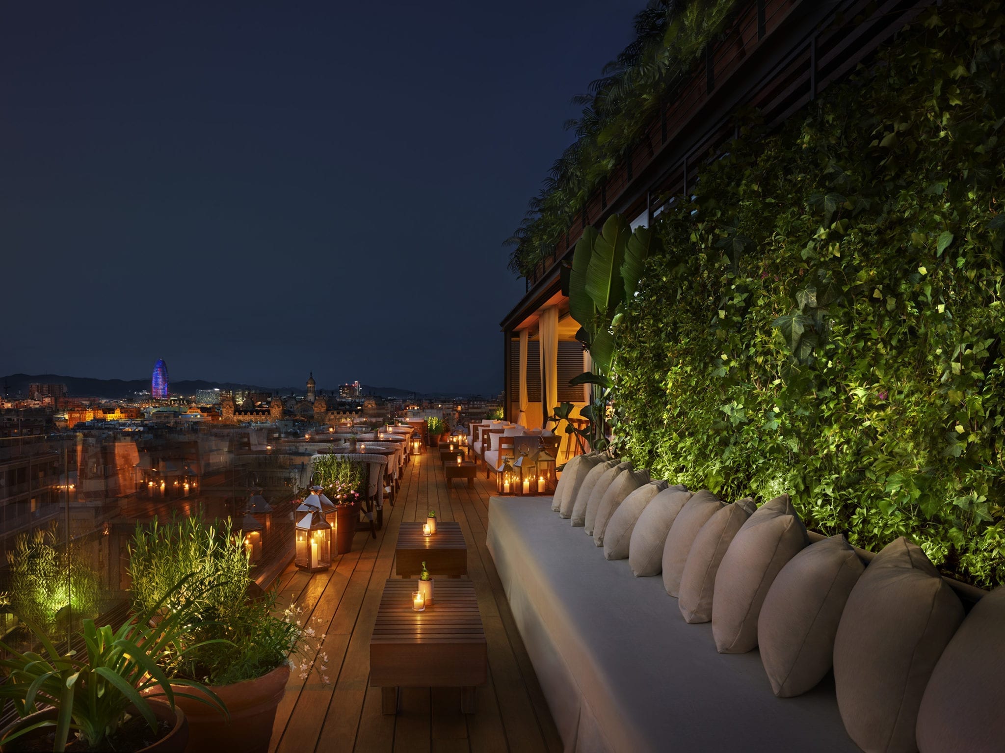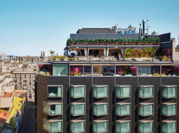 Mediterranean rooftop terrace with stunning panoramic views. Lounge seating with small tables, sofas, armchairs and sunbeds upholstered in ivory, gray and blue tones. Lushly landscaped with abundant greenery, aromatic plants and a colorful bougainvillea, creating a garden atmosphere in the sky. Bar made of a unique piece of travertine marble. Unparalleled panoramic views to the small historic buildings of the Barrio del Born and the Gothic district, Parc de la Ciutadella, the unmistakable silhouette of the Gothic cathedral of Santa Maria del Mar, the colorful and wavy roof of the Mercat de Santa Caterina and the blue of the Mediterranean sea in the distance.