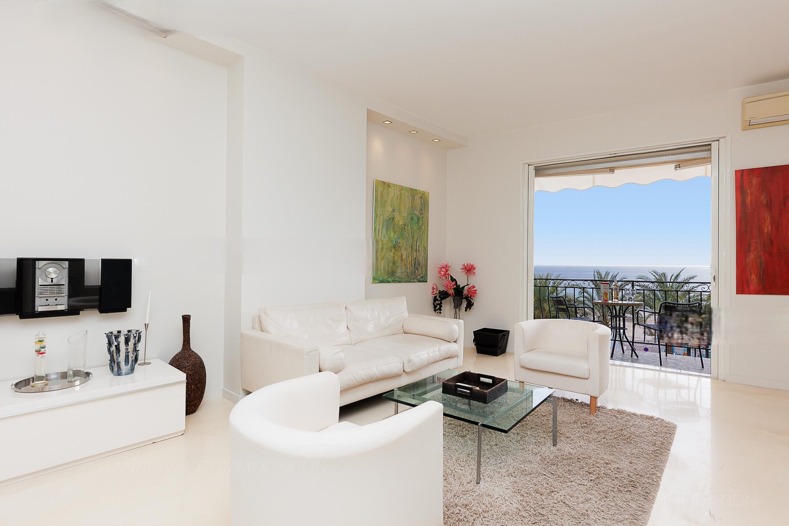 The bright and roomy living room offers a panoramic view over the Bay of Cannes. It opens onto a balcony dominating the Croisette.