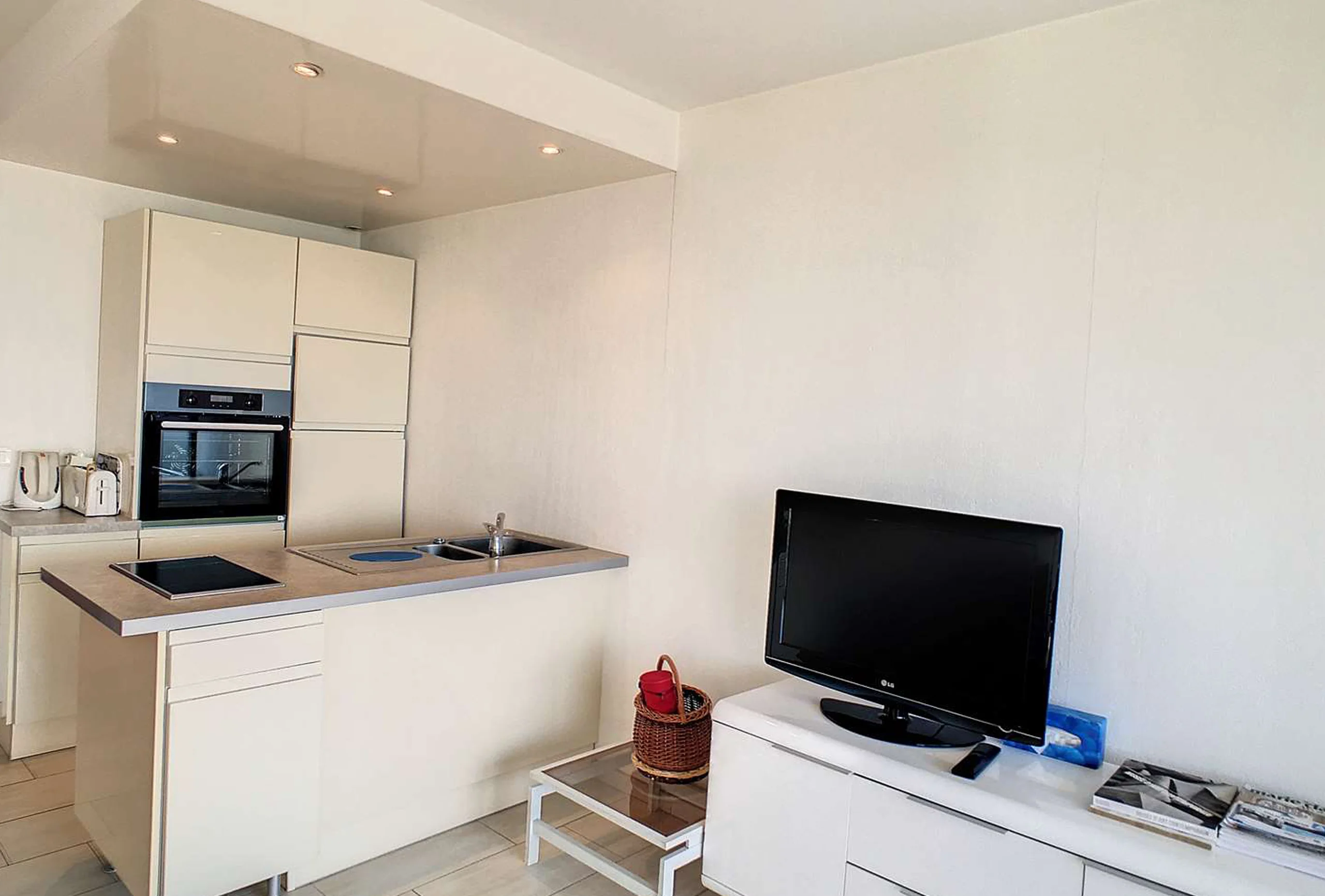 The studio is bright and offers beautiful views of the garden and the sea. It features a comfortable sofa bed and a double bed in an alcove. The open-plan kitchen is fully equipped with a dishwasher, oven, fridge, freezer, and other essentials. The bathroom includes a shower and a washing machine, with a separate toilet for added convenience.