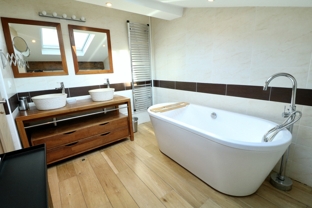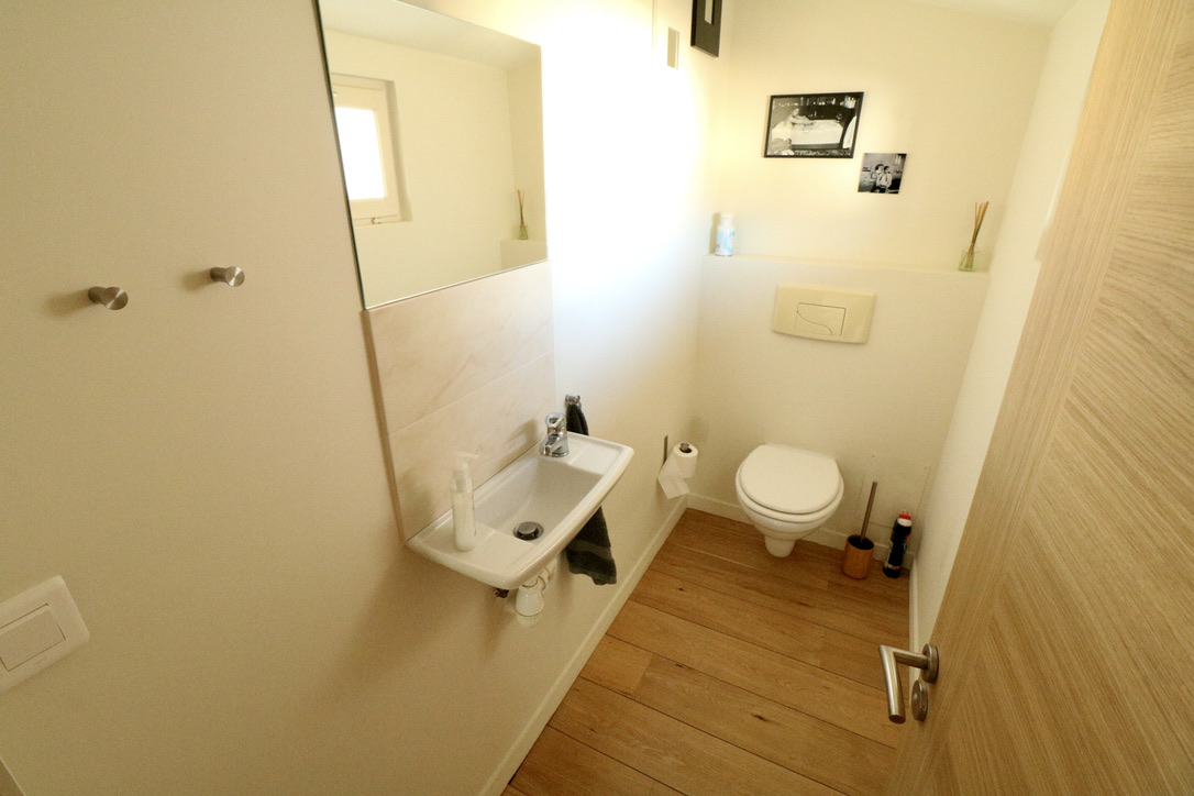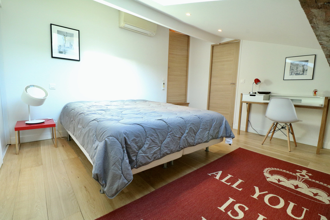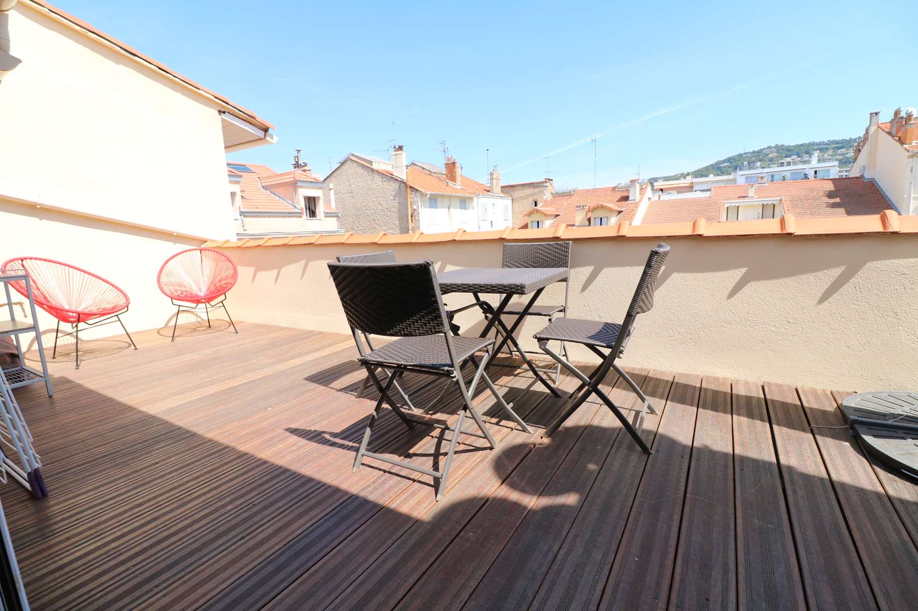 The serene bedroom includes a double bed and an elegant en suite bathroom with a bathtub, double sink, and washing machine. A separate guest toilet adds extra convenience. Enjoy quiet moments on the furnished north-facing terrace—an ideal spot to relax after a day exploring Cannes.