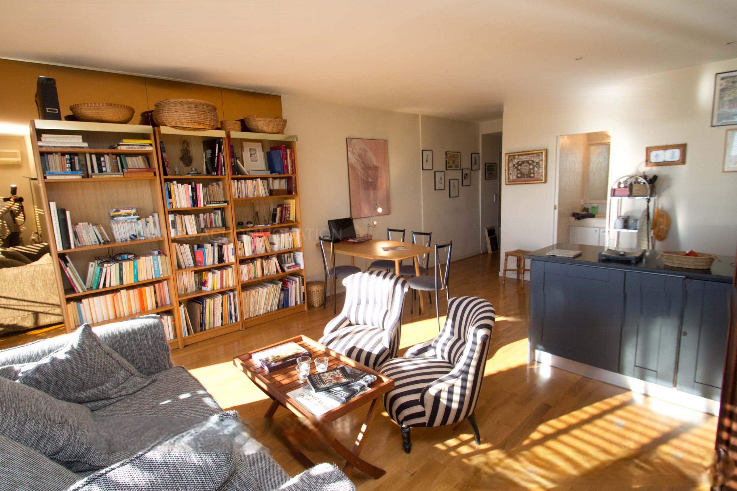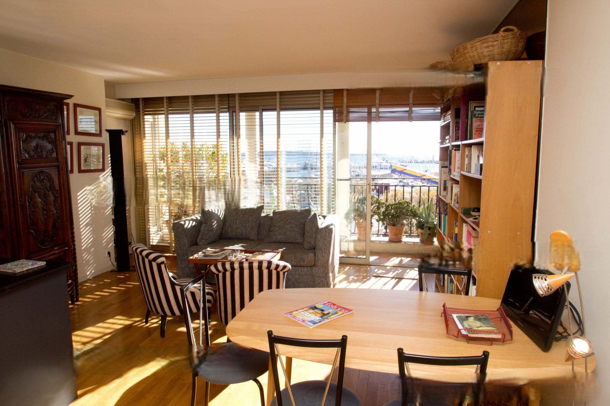 The living-room is bathed with sunlight. It features a dining corner thanks to the open-plan kitchen. The lounge area is very cosy with its shelves full of books. The room opens ono the balcony offering a beautiful view over the harbour and the sea.