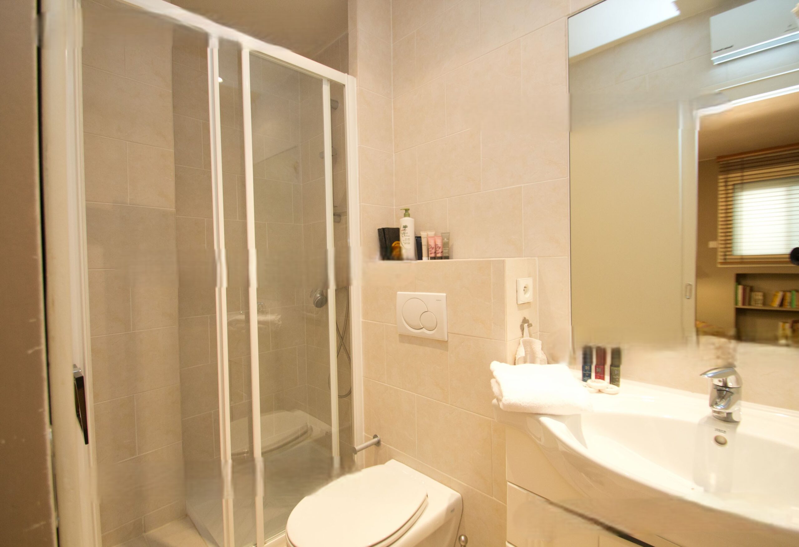 A second bathroom is equipped with shower and toilets as well.