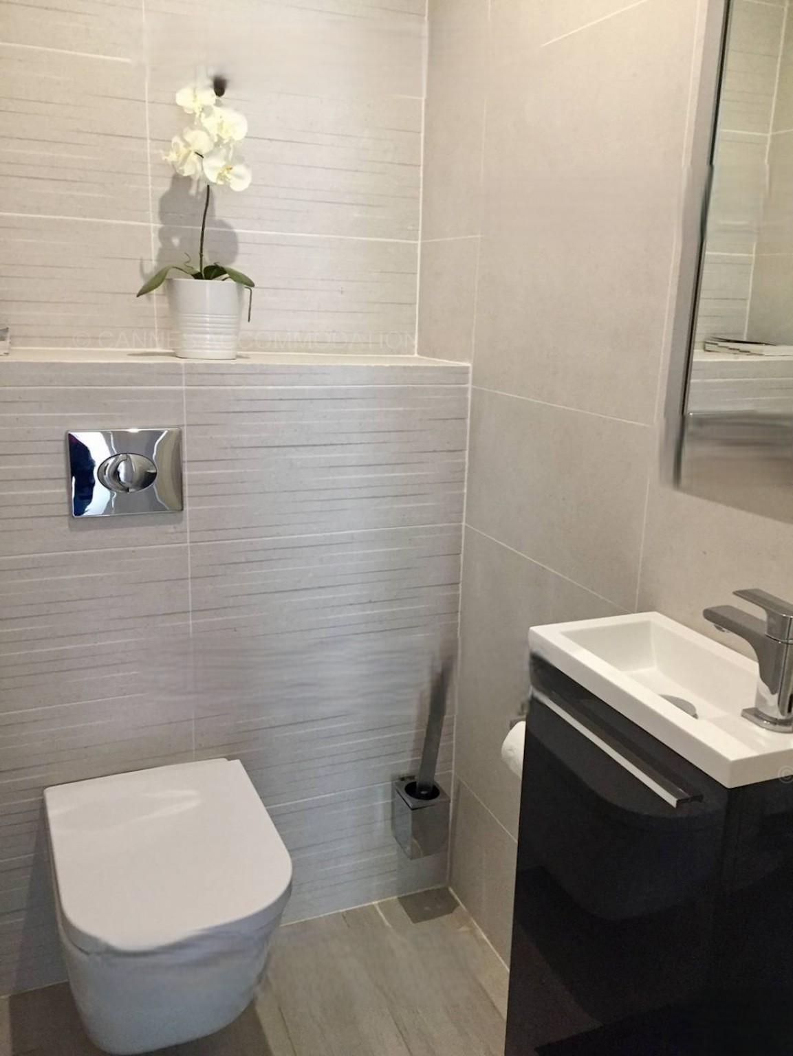 The bathroom has a double sink and a walk-in shower. The toilets are separate.