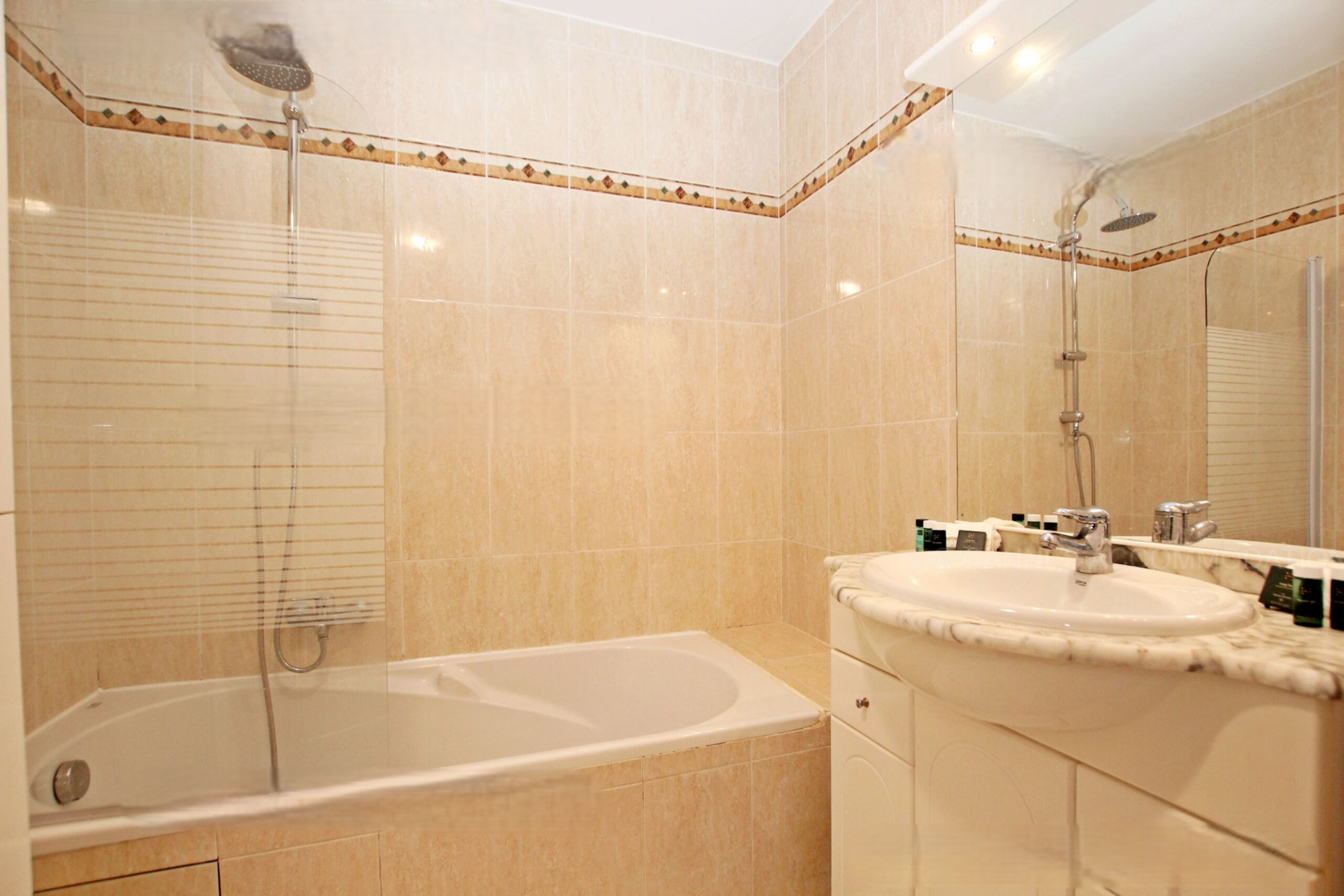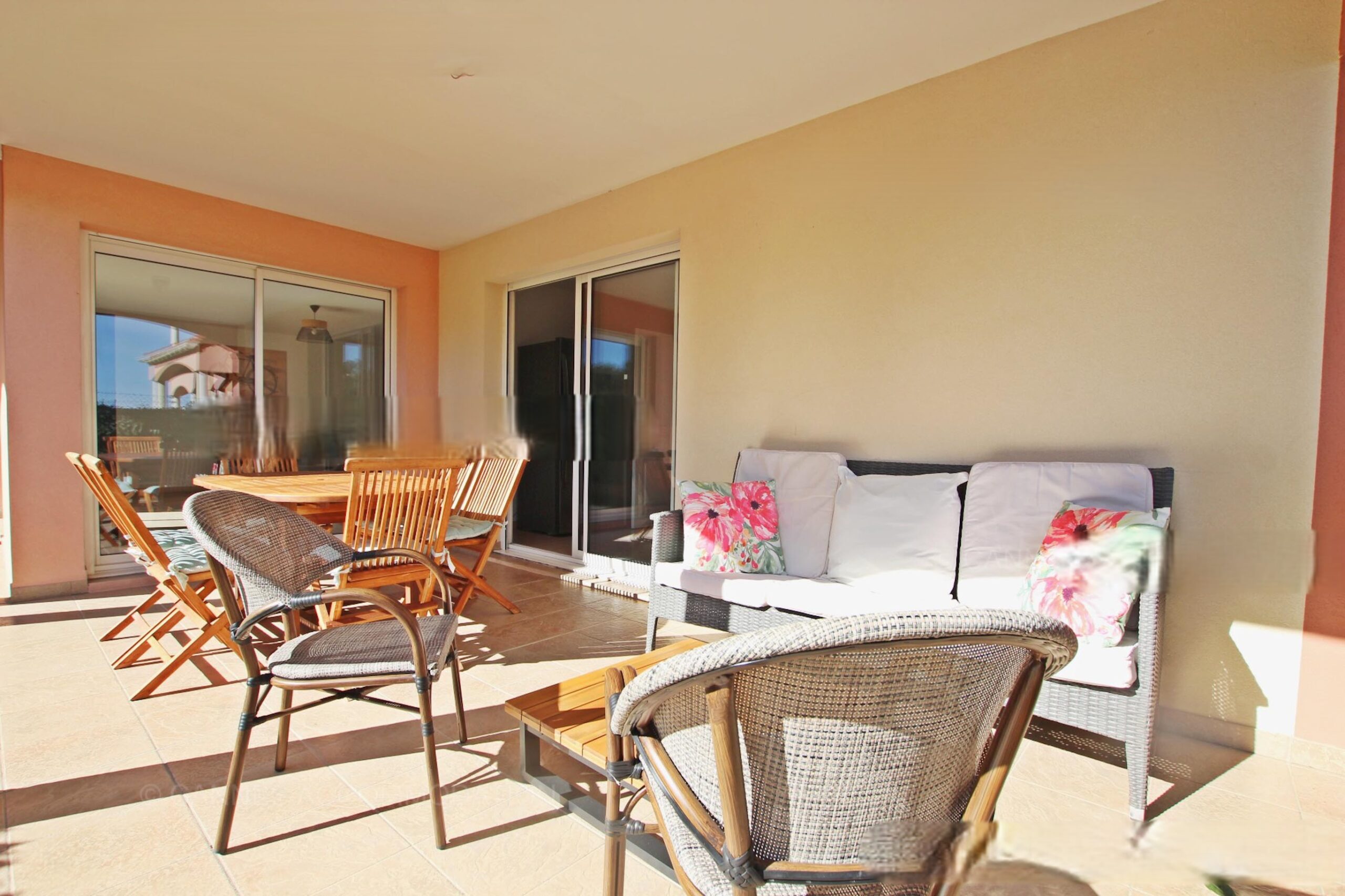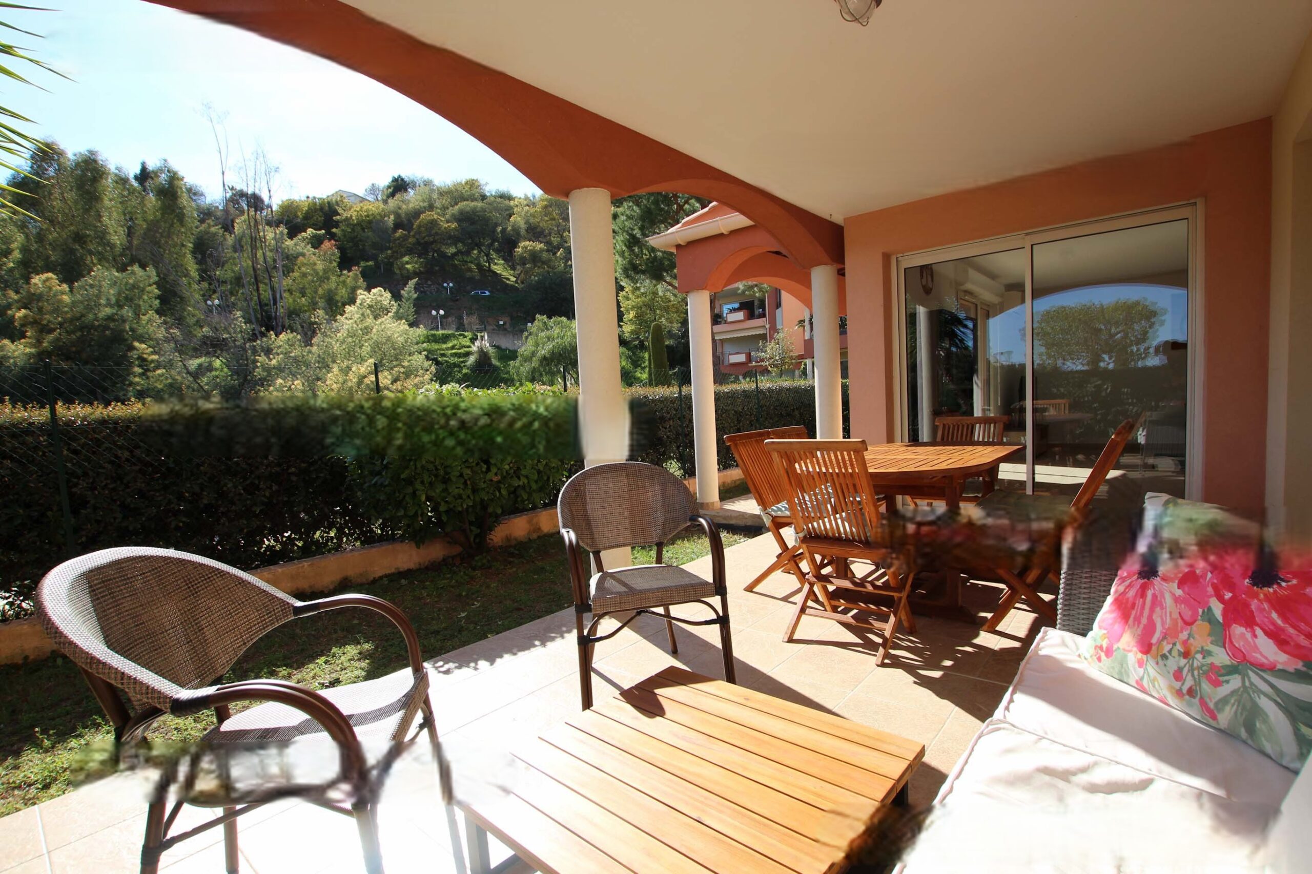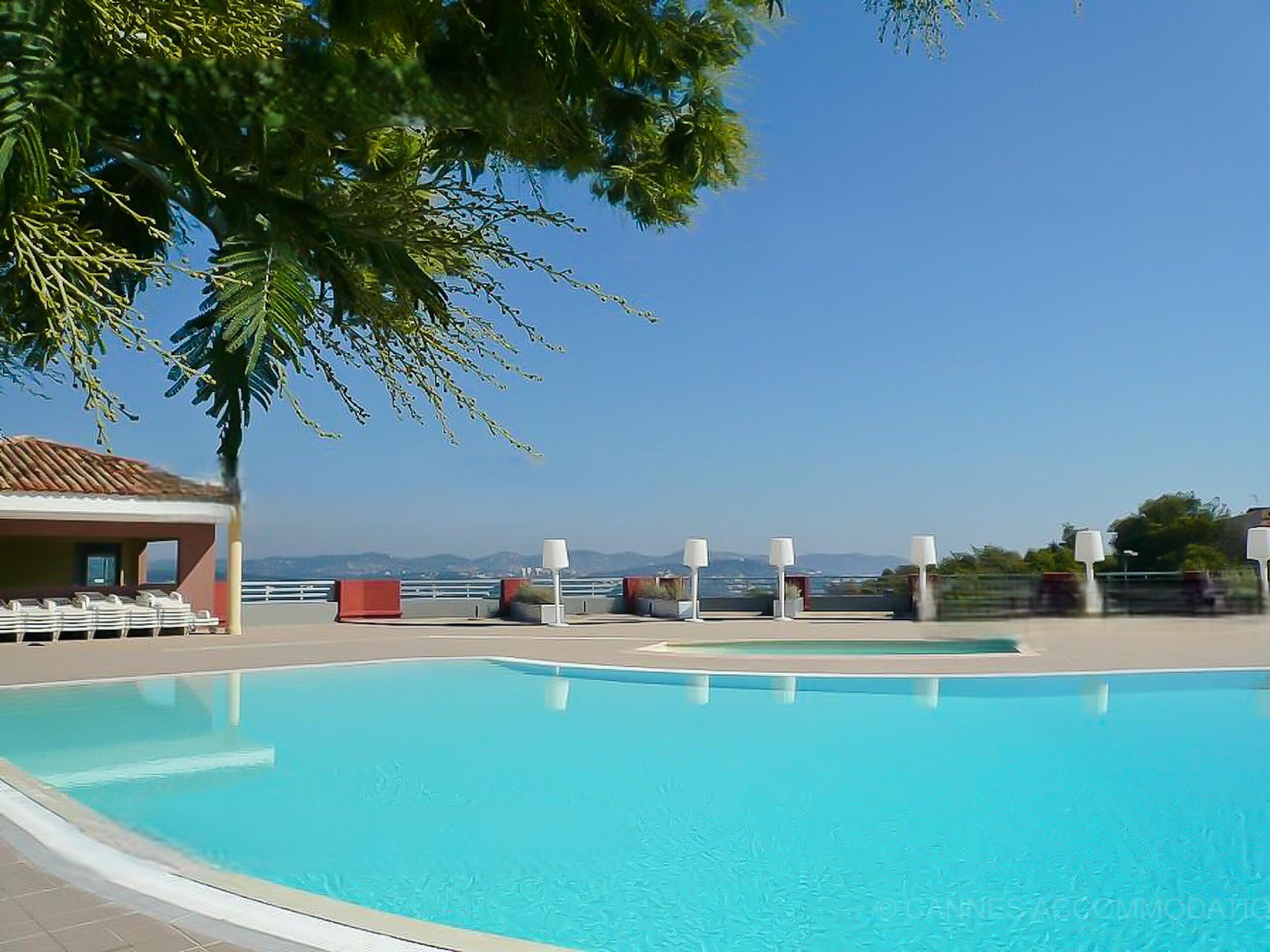 6 km from Cannes, on a luxurious estate located on the heights of Mandelieu. In common: 27 ha park, large swimming pool with steps (23m x 10m, 80-200cm deep), children’s pool, 2 tennis courts, table tennis. Shops, restaurants, supermarket 2 km. Sandy beach and golf course 4 km. 1 private garage.