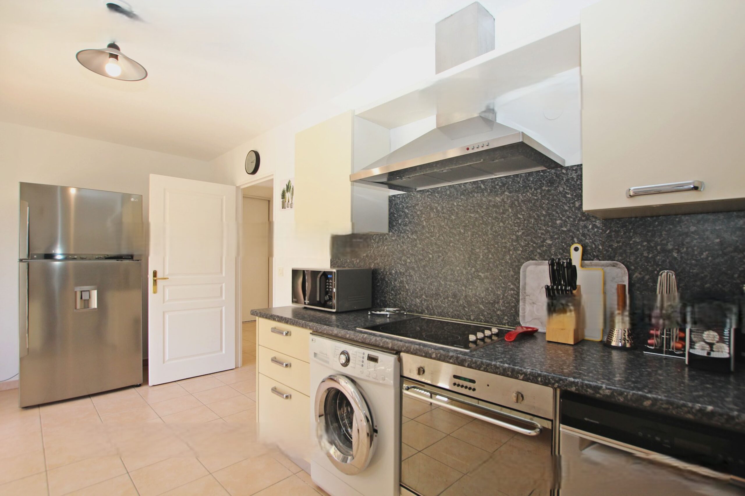 Fully equipped kitchen: ceramic hob, oven, microwave, toaster, kettle, Nespresso.