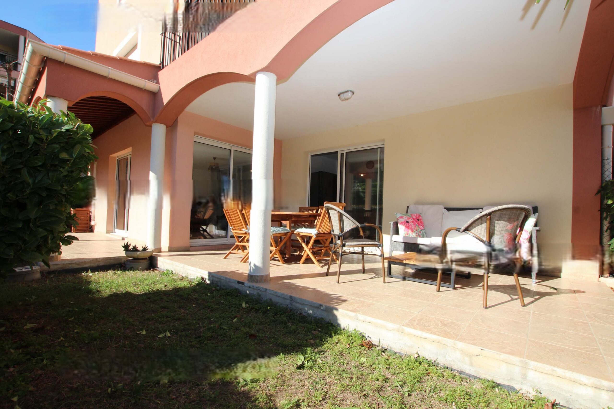 Garden with terrace, outdoor dining table and sofa. Sea view.