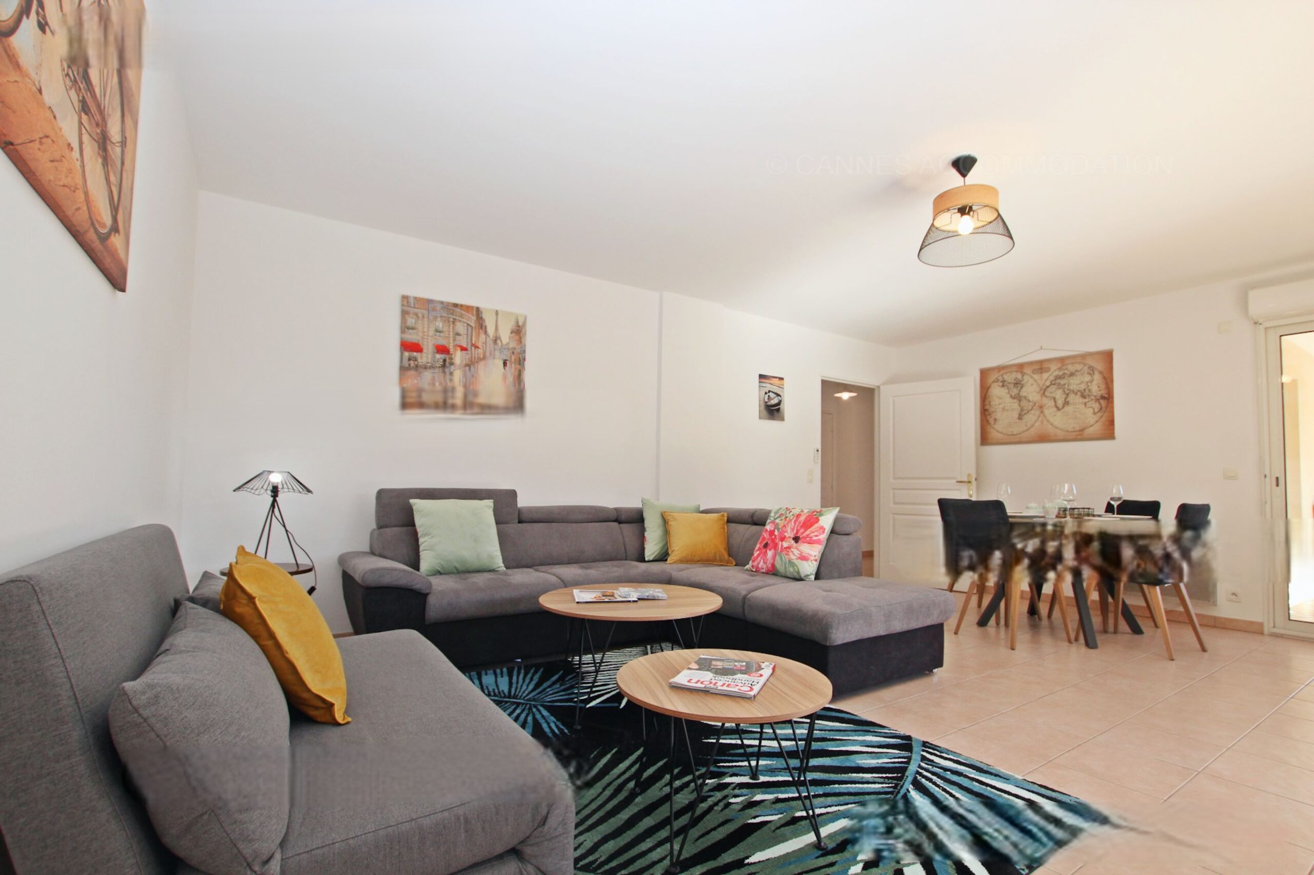 Living/dining room with sofa, television (smart TV), dining table. Access to terrace.