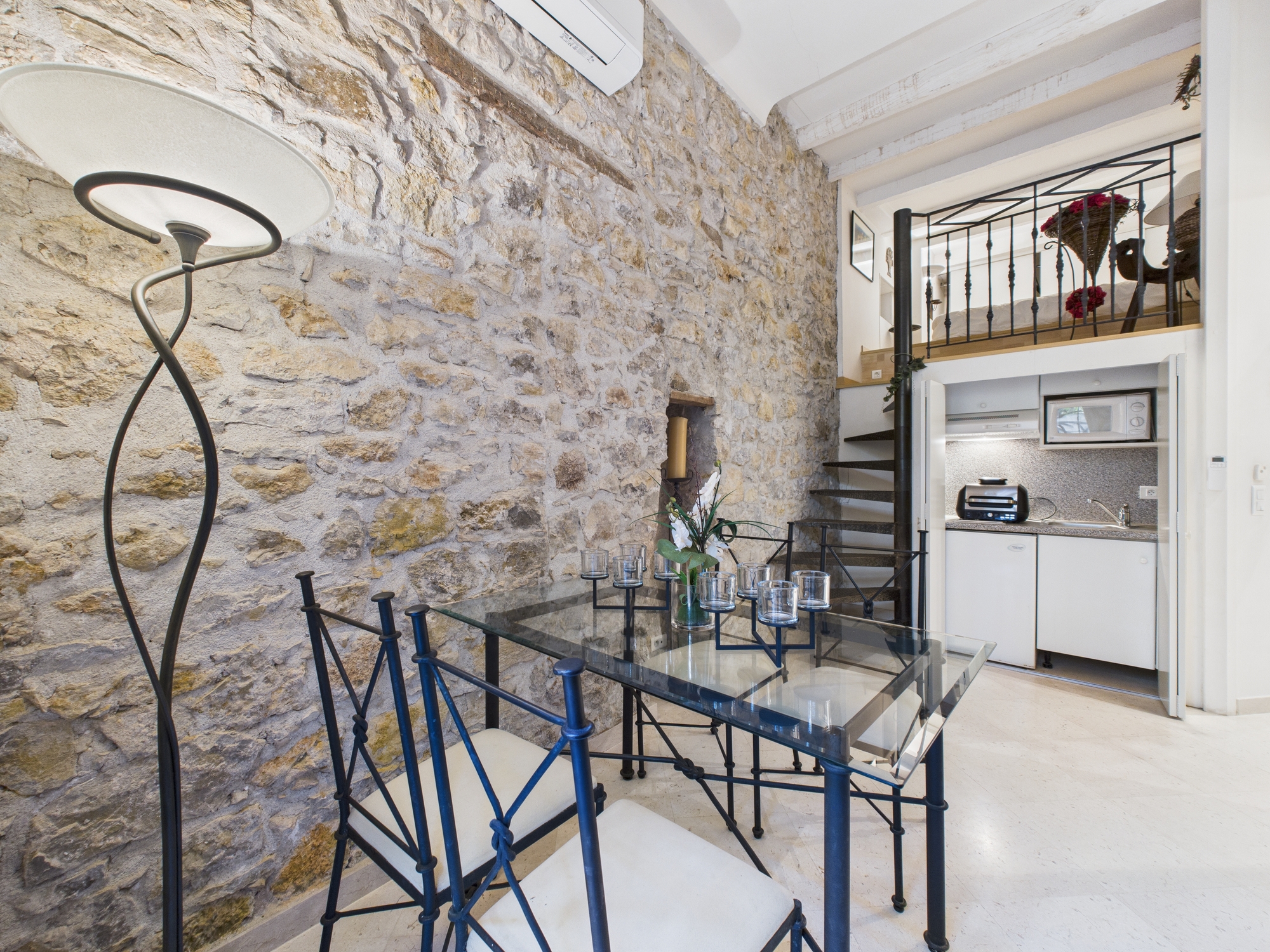 The fourth bedroom is located on a mezzanine level accessed via a small staircase and includes a double bed, along with a small dining area and kitchenette (without a separating door).