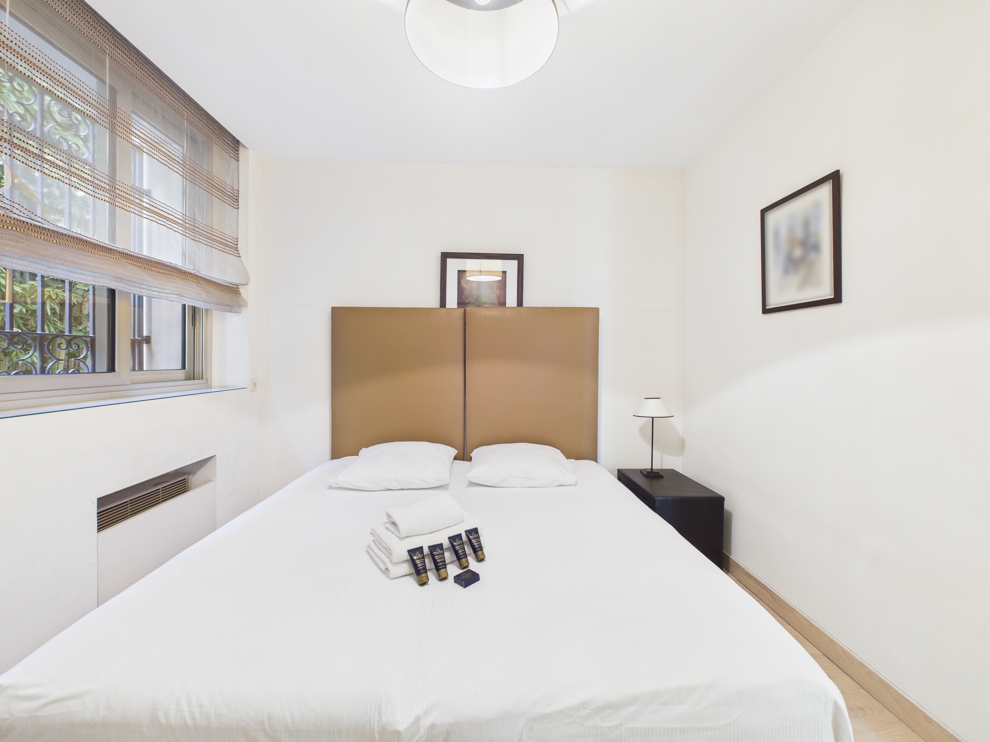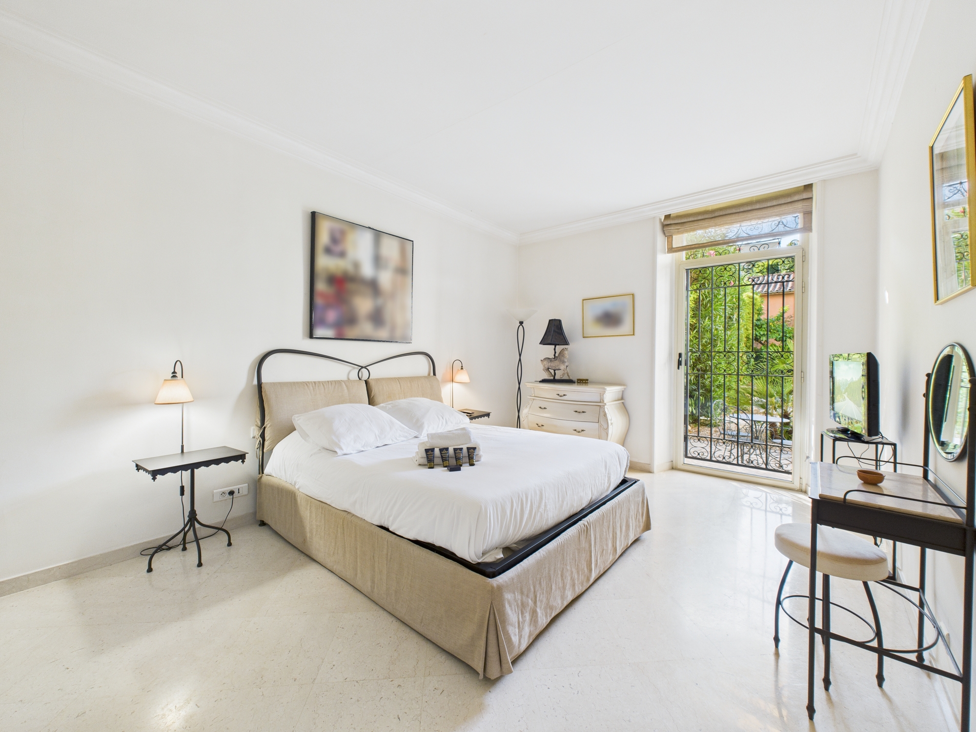 The second bedroom offers a double bed, bedside tables, a large wardrobe, and garden access.