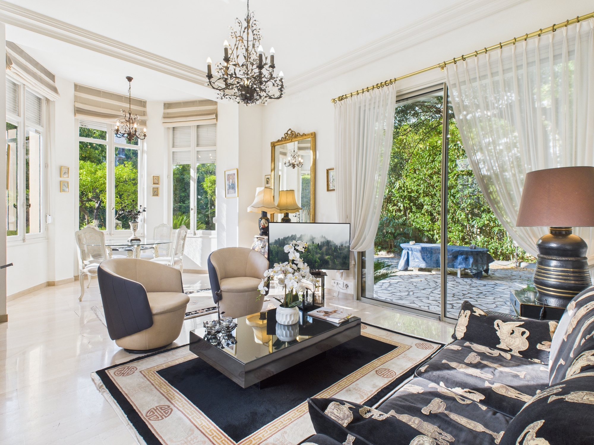 The bright and elegantly furnished living room features a large sofa, comfortable armchairs, a TV, and a dining table for four. Expansive glass sliding doors open directly onto the private garden and terrace, where outdoor seating provides the perfect setting for relaxing or entertaining.