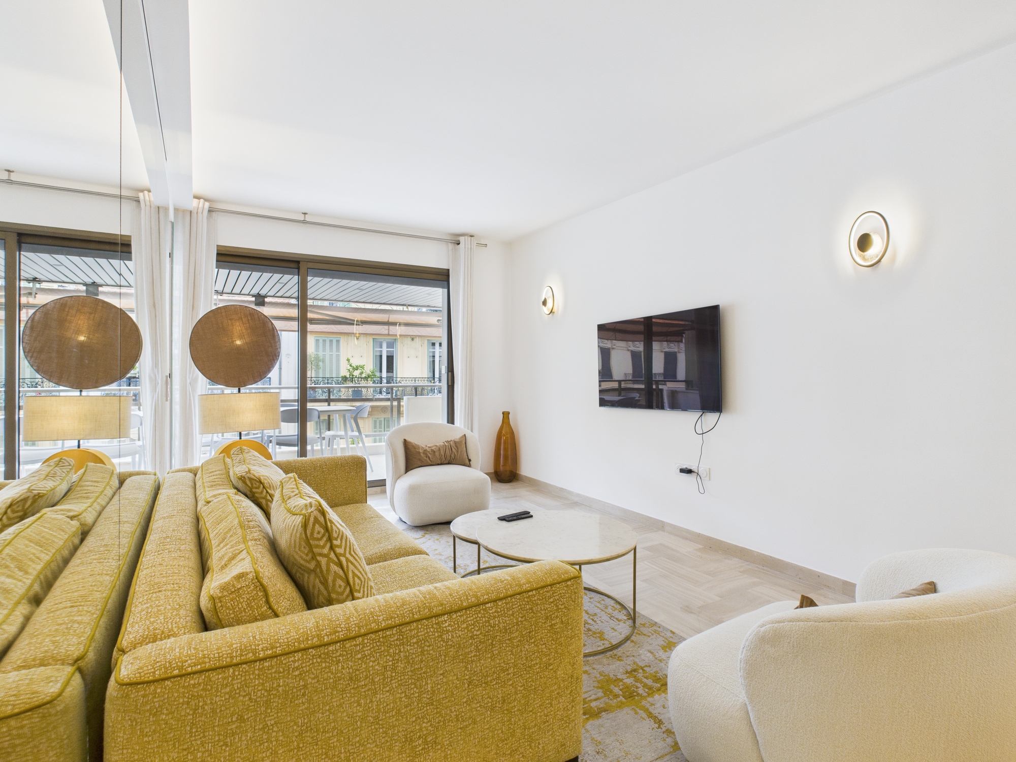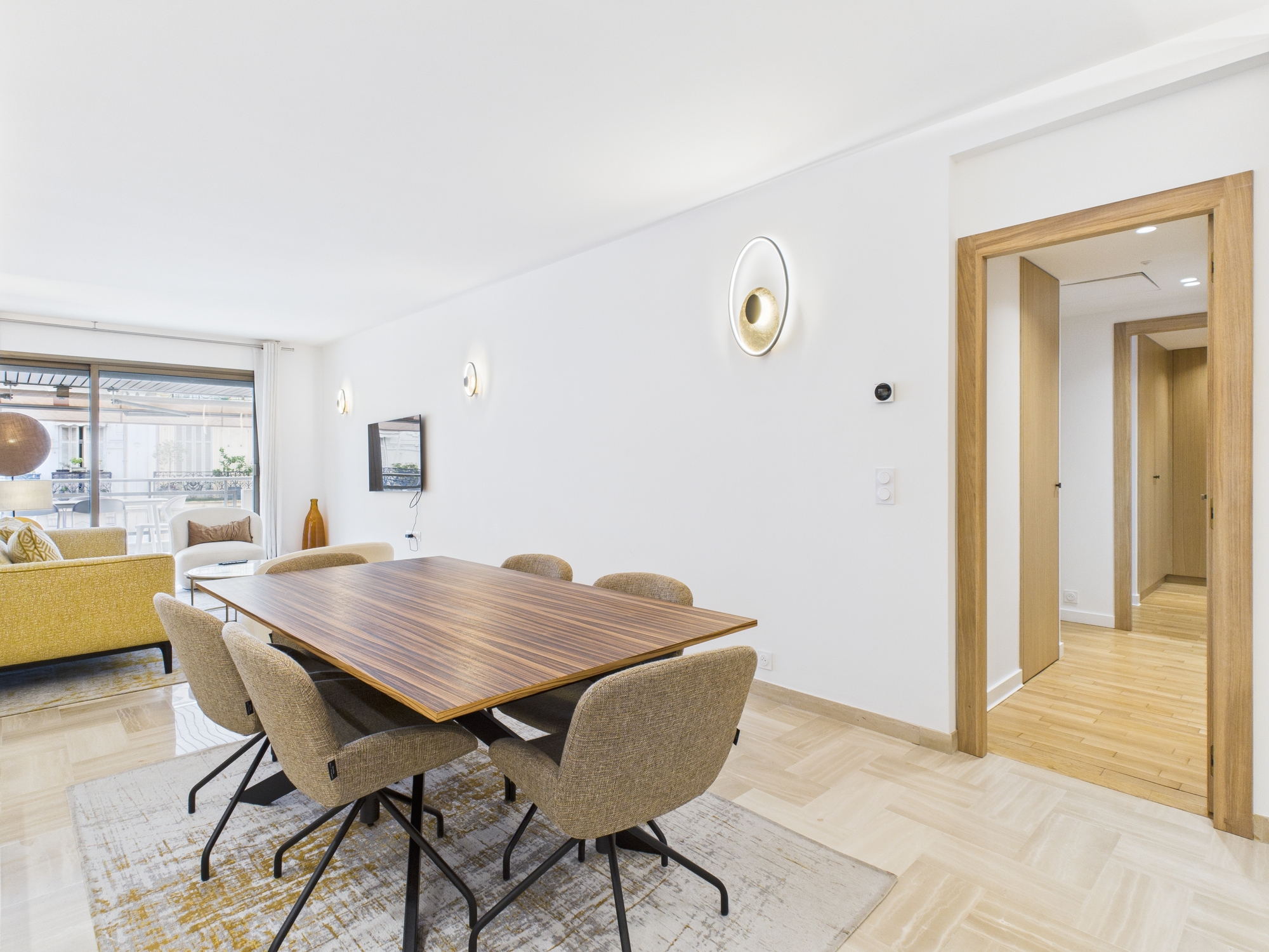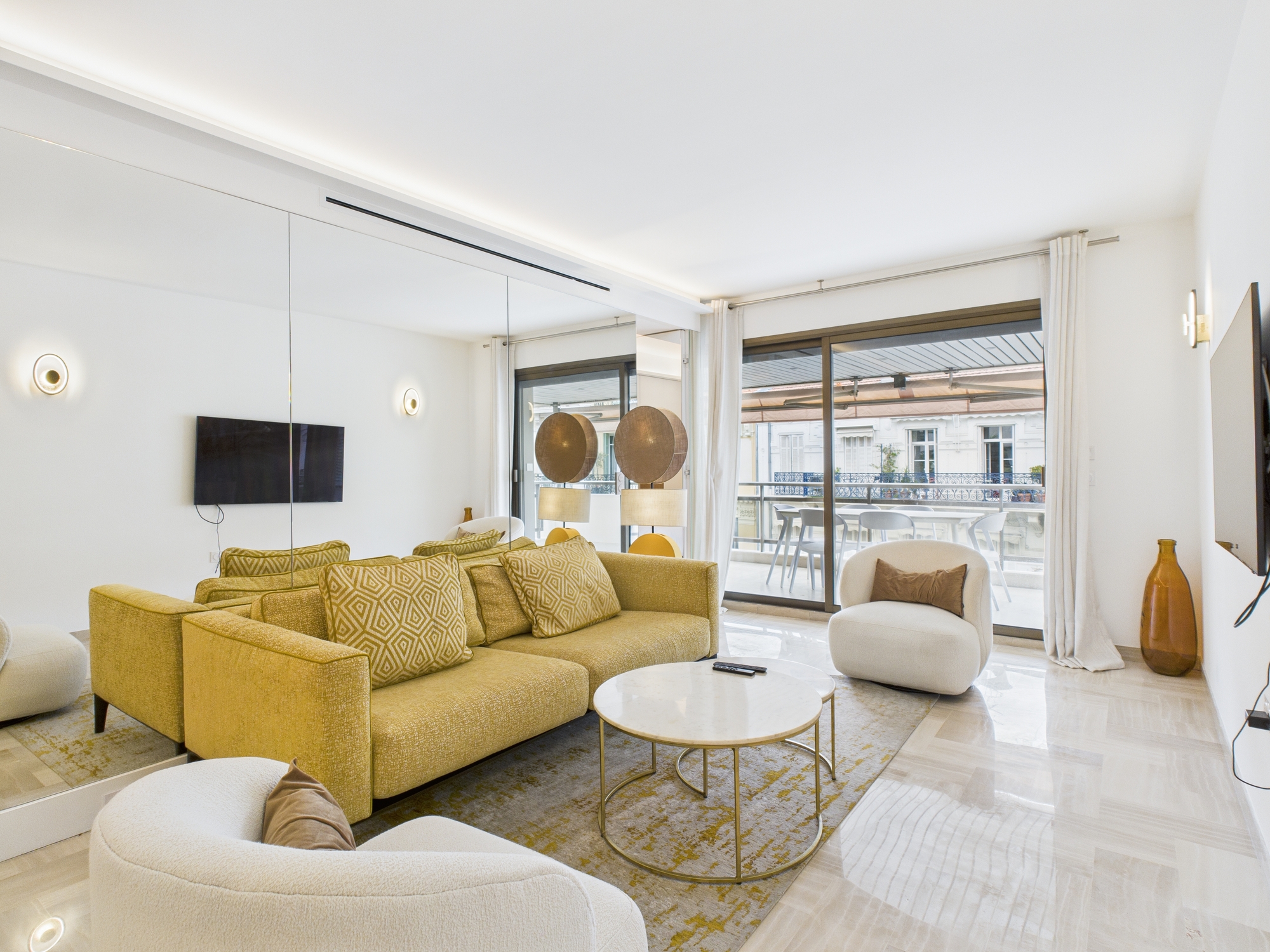 The bright and comfortable living area features a sofa, two armchairs, a coffee table, and a flat-screen TV. A dining table with seating for six provides the perfect space for shared meals or gatherings. Large sliding glass doors open onto a generous balcony, furnished with a table, six chairs, and two sun loungers — ideal for enjoying the Cannes sunshine.