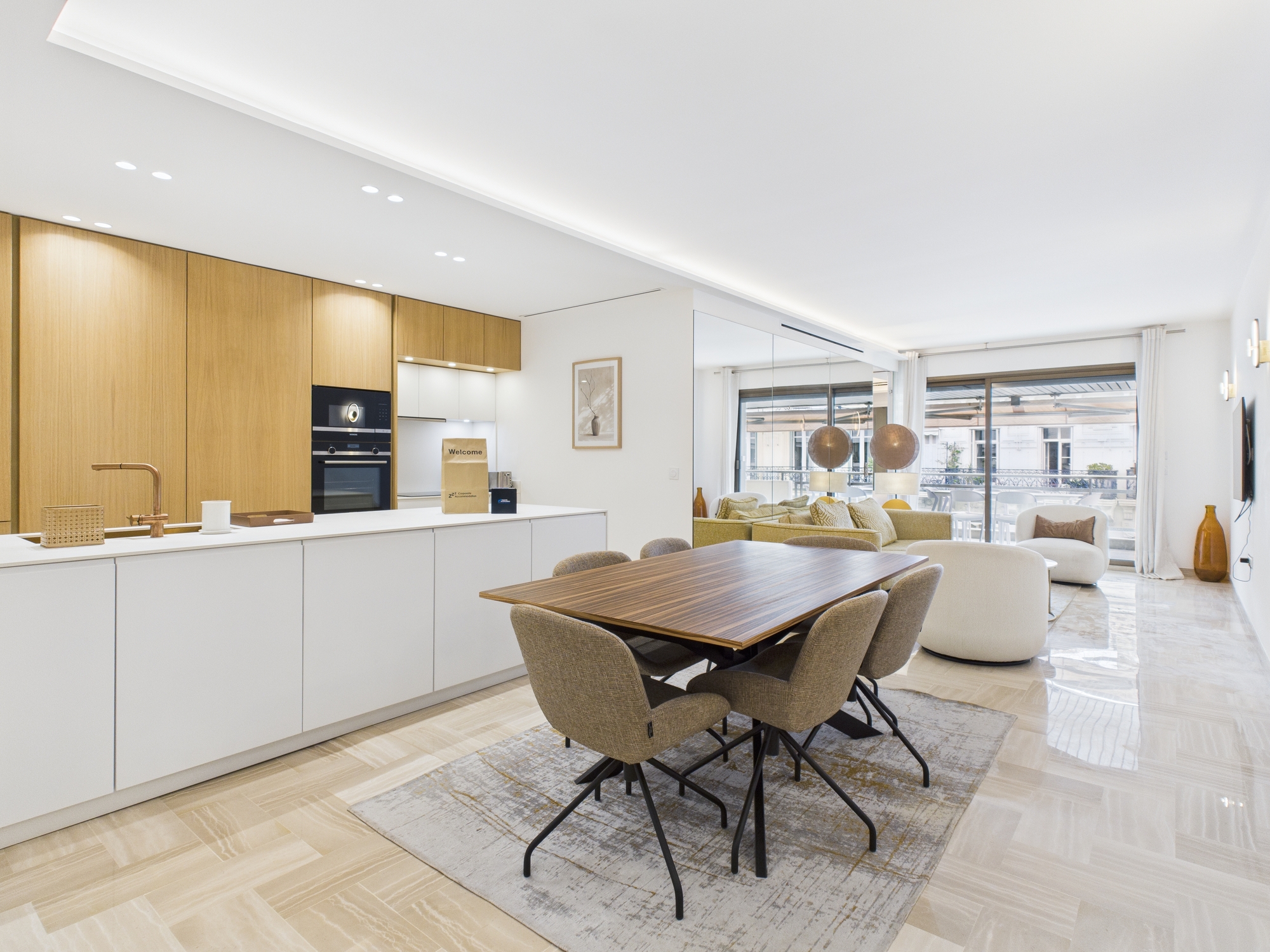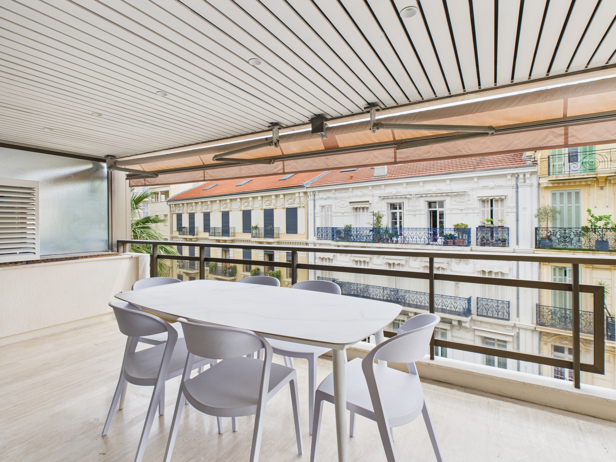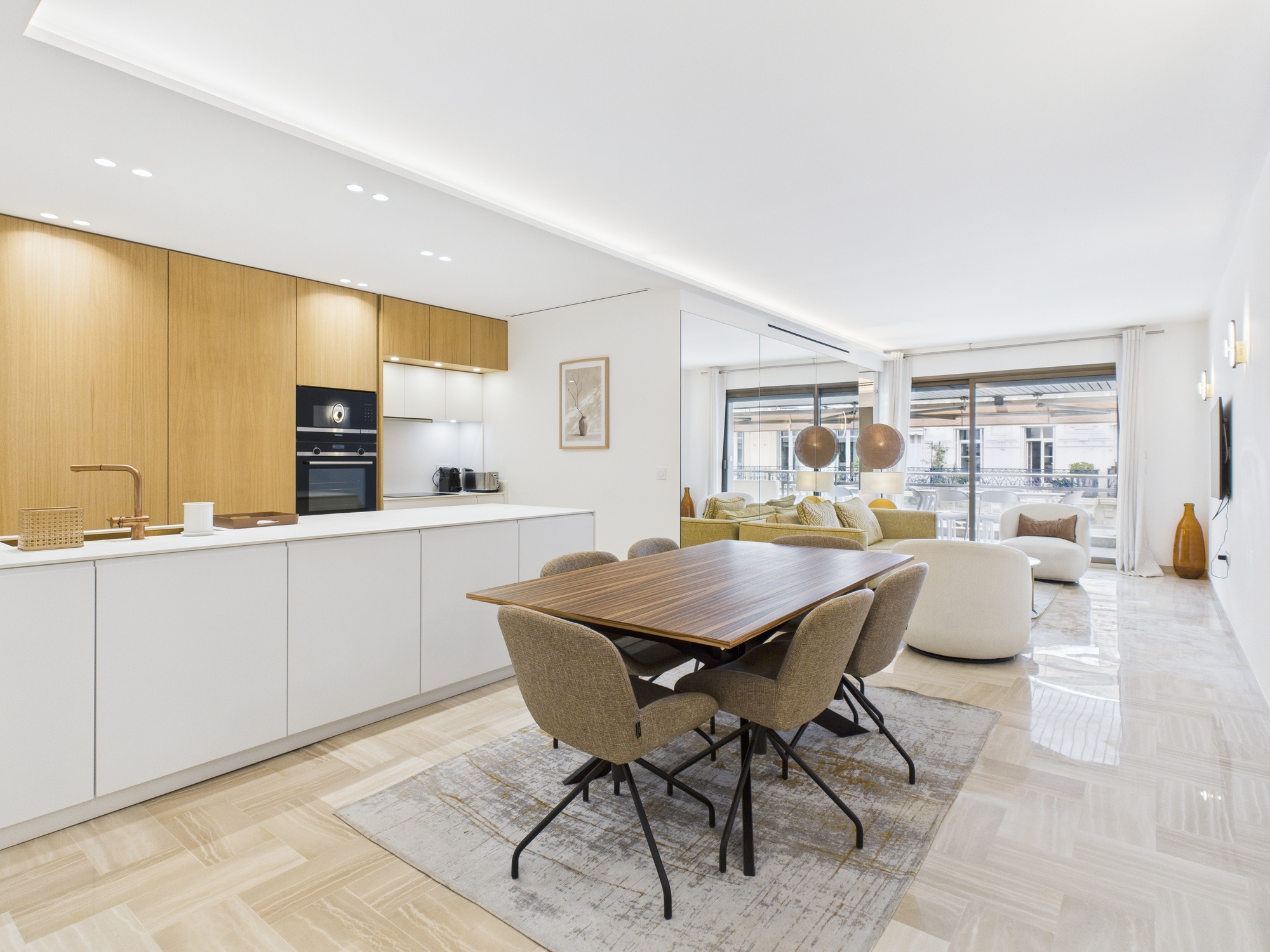 The bright and comfortable living area features a sofa, two armchairs, a coffee table, and a flat-screen TV. A dining table with seating for six provides the perfect space for shared meals or gatherings. Large sliding glass doors open onto a generous balcony, furnished with a table, six chairs, and two sun loungers — ideal for enjoying the Cannes sunshine.