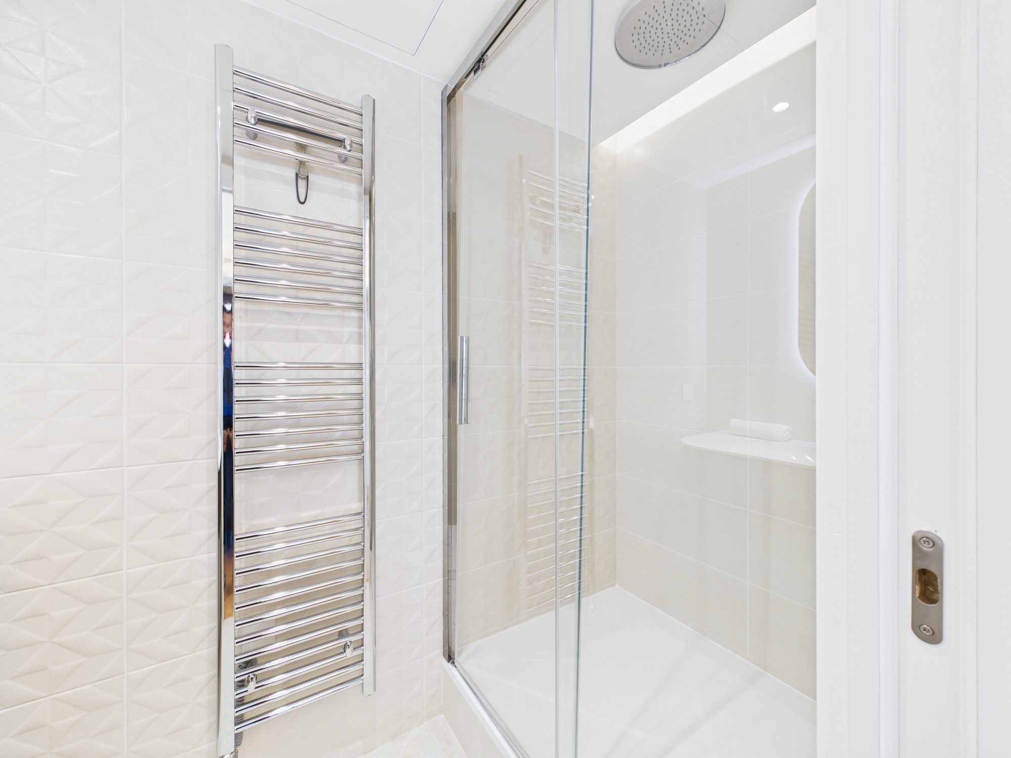 • The second bedroom features a double bed, built-in wardrobe storage surrounding the bed, and an ensuite shower room with a washbasin.